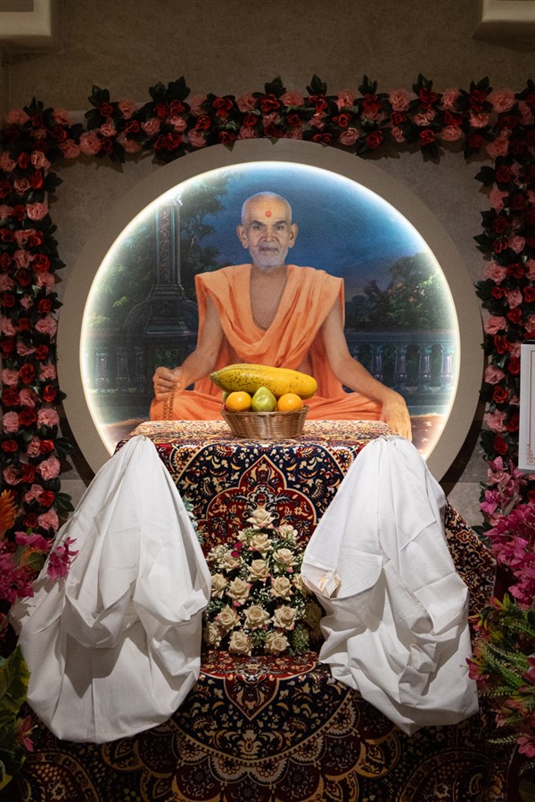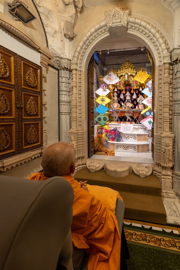 Swamishri engrossed in darshan of Shri Harikrishna Maharaj and Shri Gunatitanand Swami Maharaj