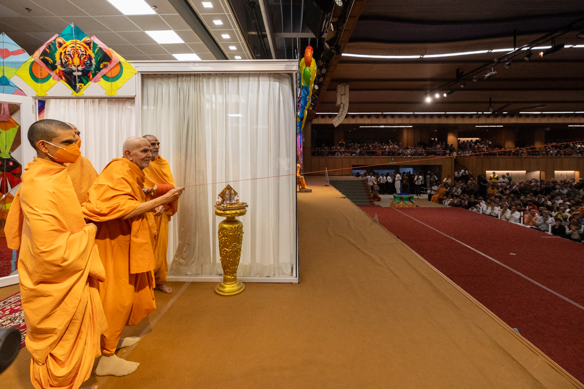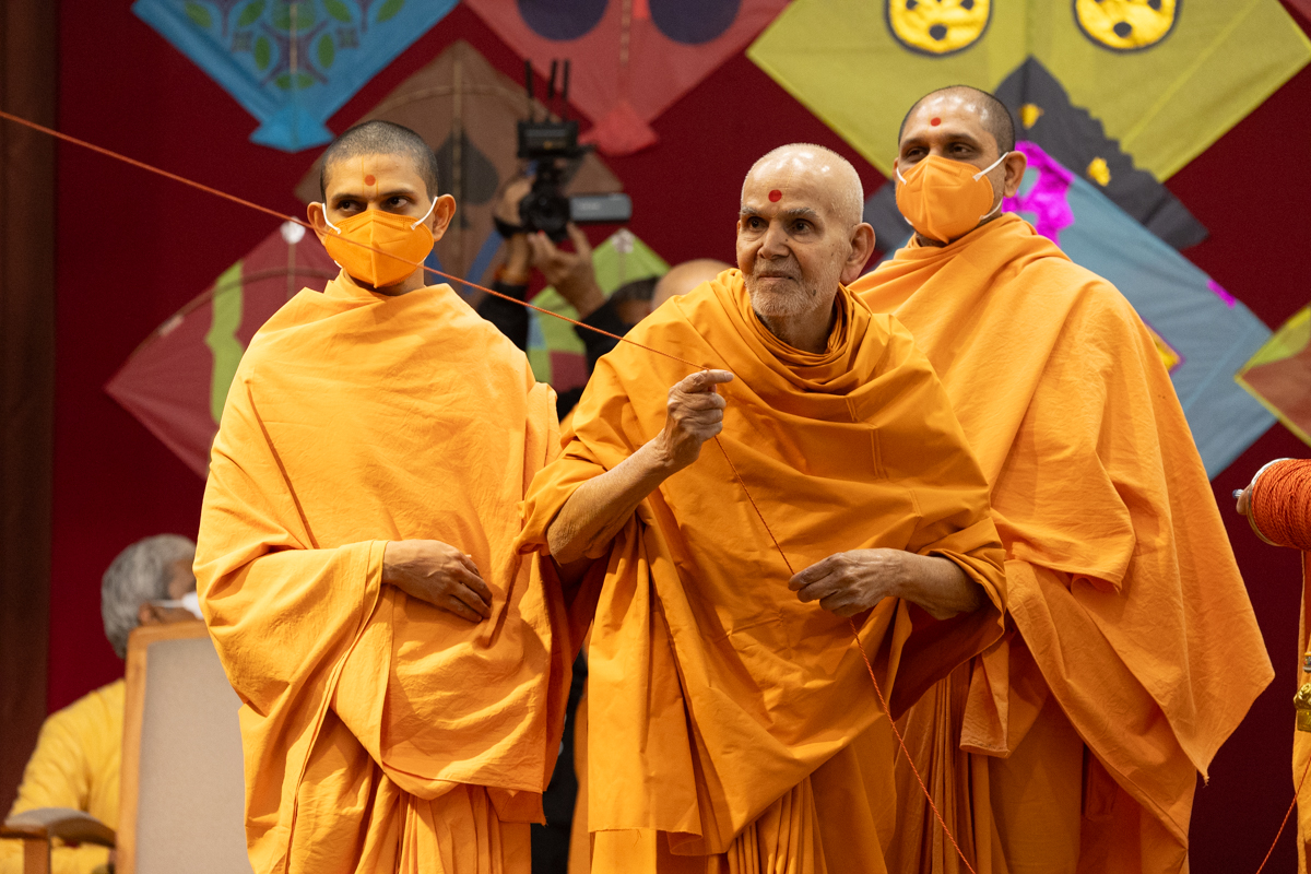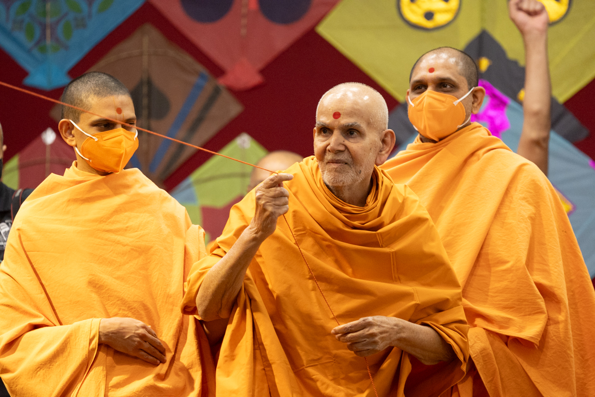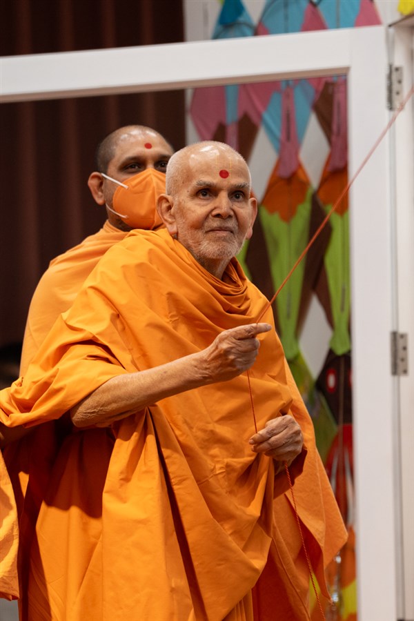 Swamishri holds the string of a kite
