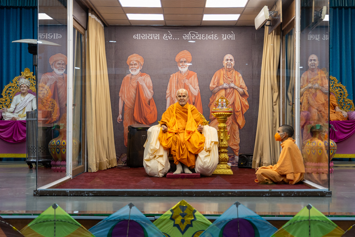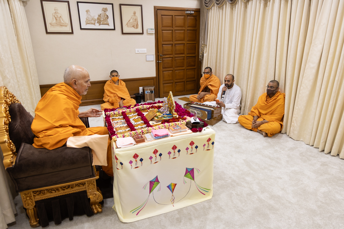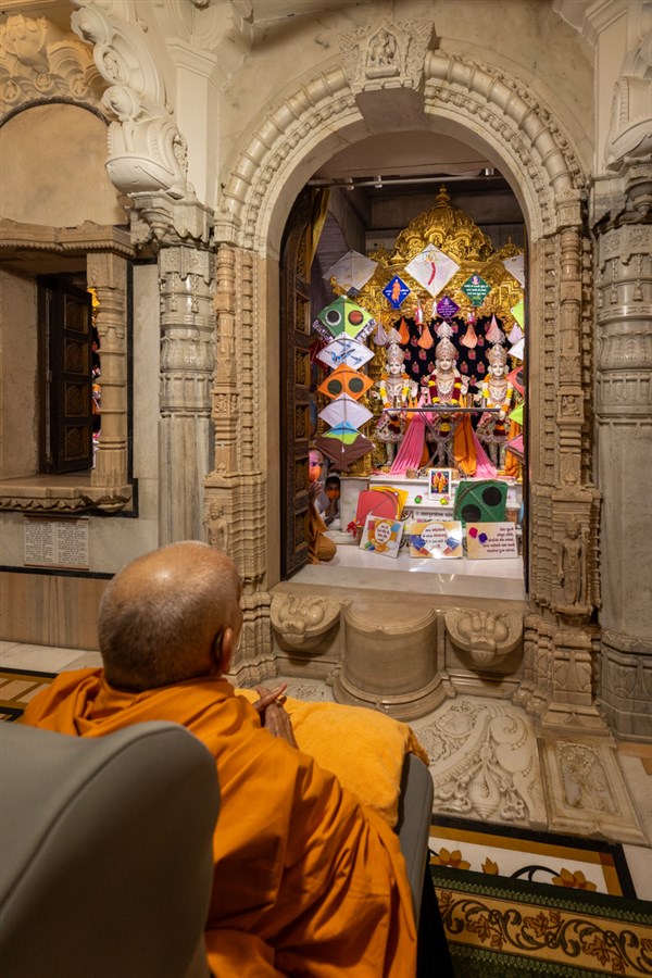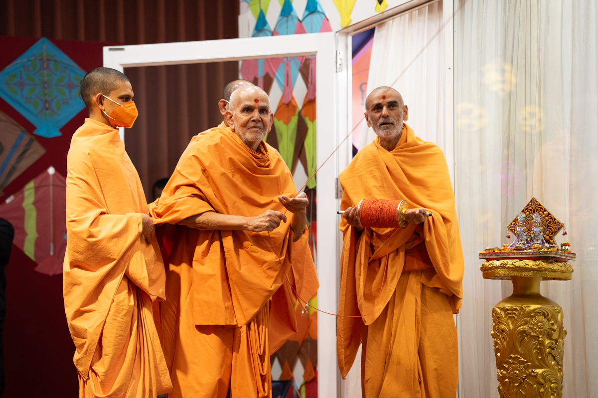 Swamishri holds the string of a kite