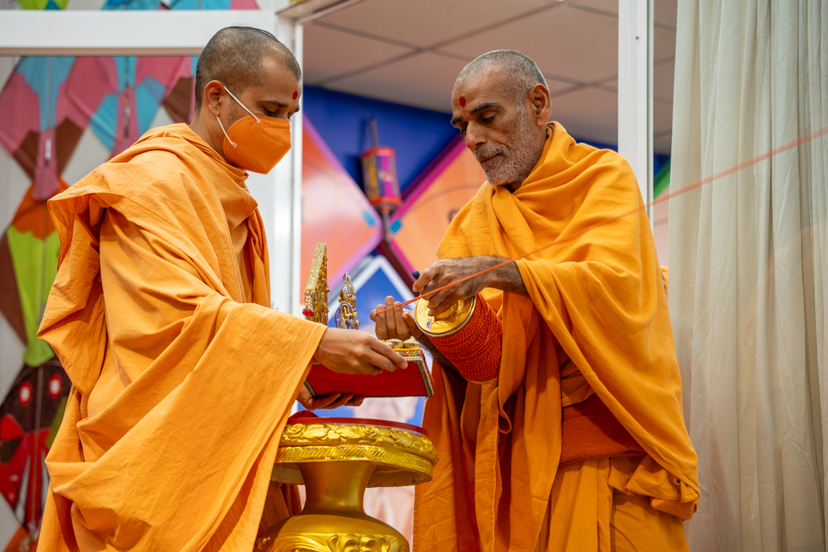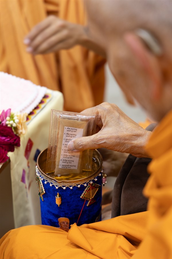 Swamishri sanctifies water with the holy relics of Bhagwan Swaminarayan and the Guru Parampara