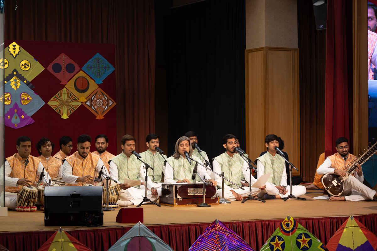 Yuvaks sing kirtans at the beginning of the morning Uttarayan-Jholi celebration assembly