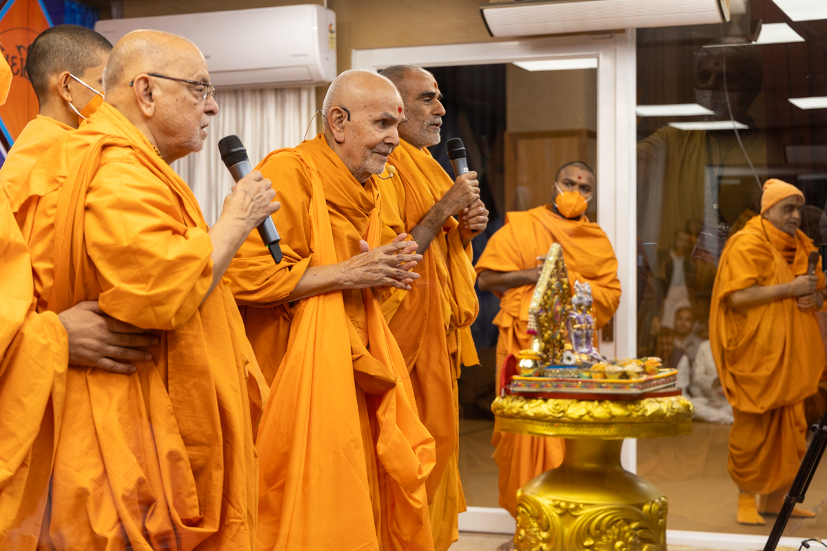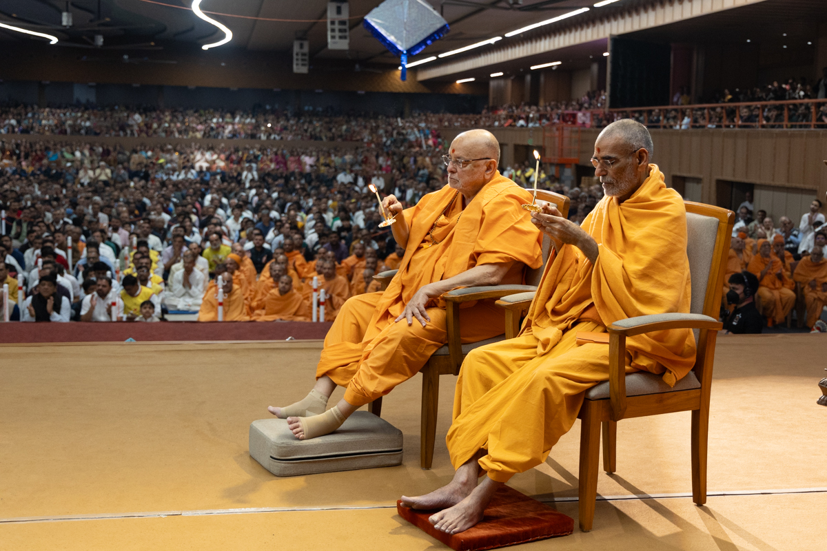 Swamishri and senior swamis perform the arti