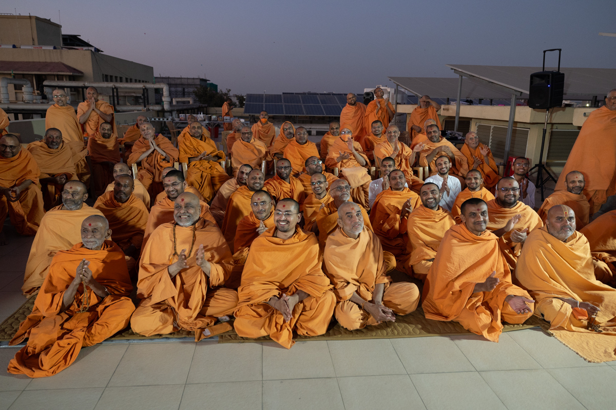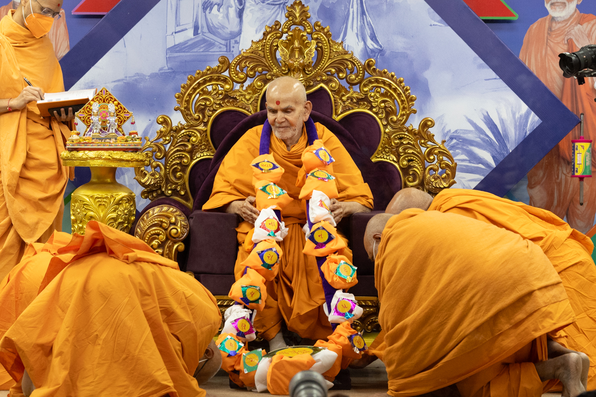 Swamis honor Swamishri with a garland