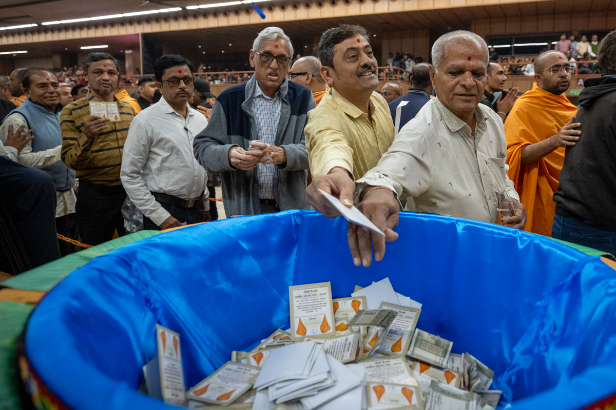 'Swaminarayan Hare, Sachchidanand Prabho...' Swamishri, Pujya Ishwarcharan Swami and Anandswarup Swami proclaim the jholi call