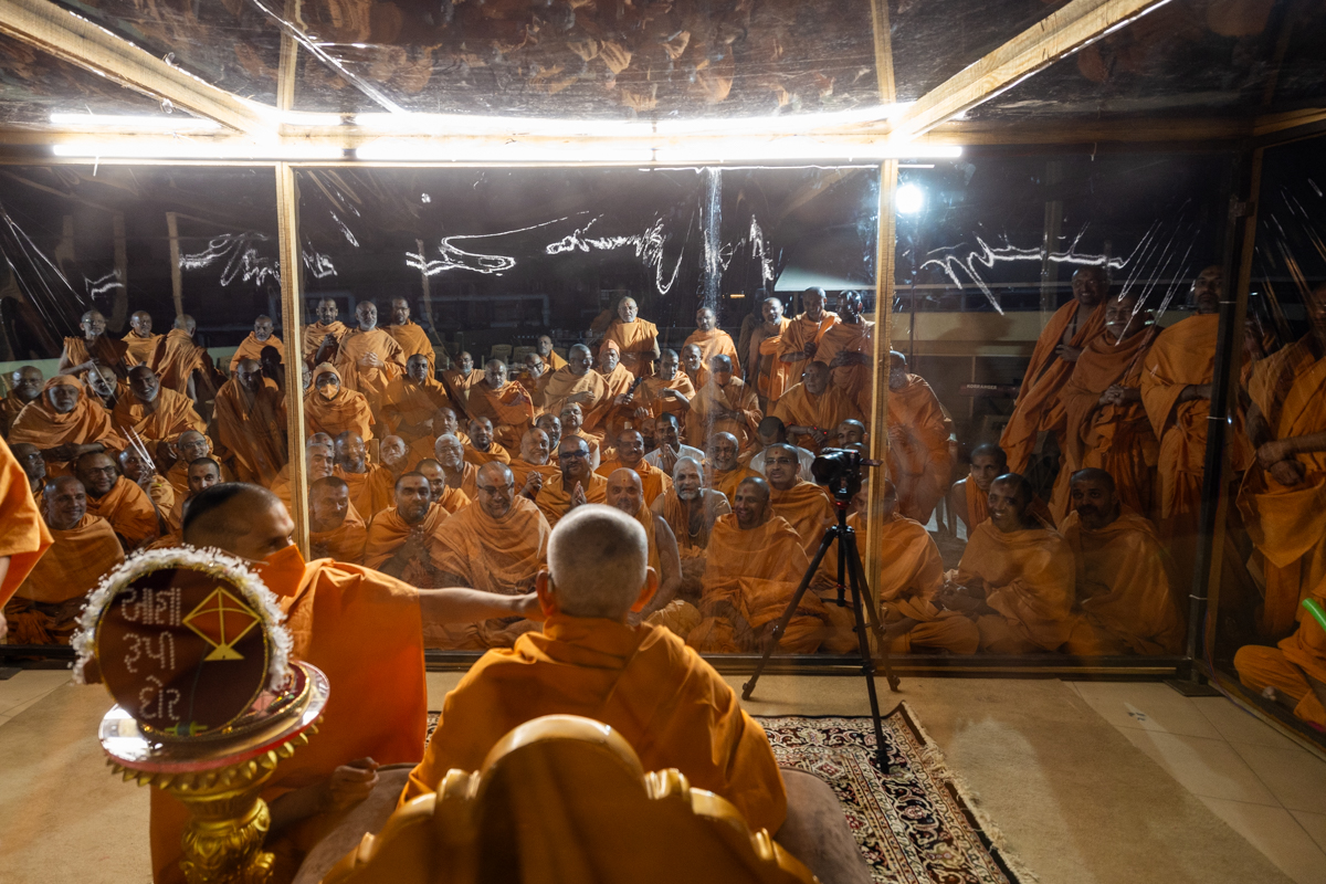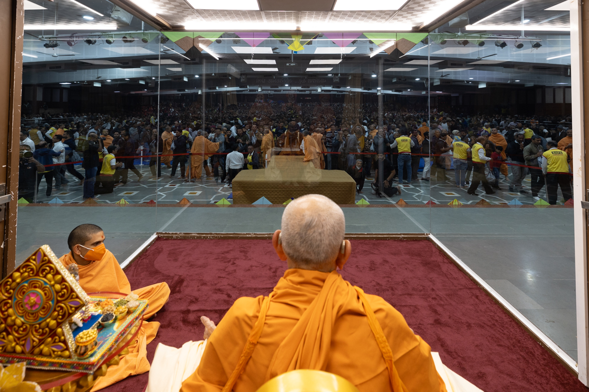 Swamis and devotees doing darshan of Swamishri
