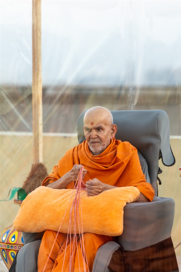 Swamishri turns the mala in his daily puja