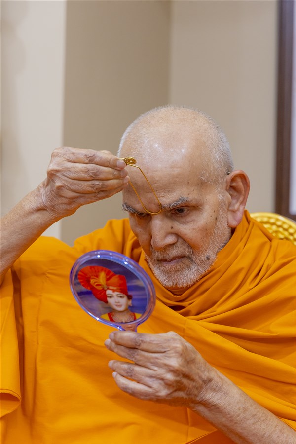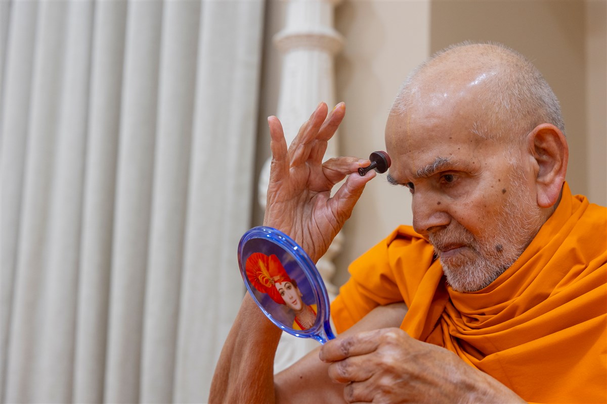 Param Pujya Mahant Swami Maharaj applies a tilak on his forehead