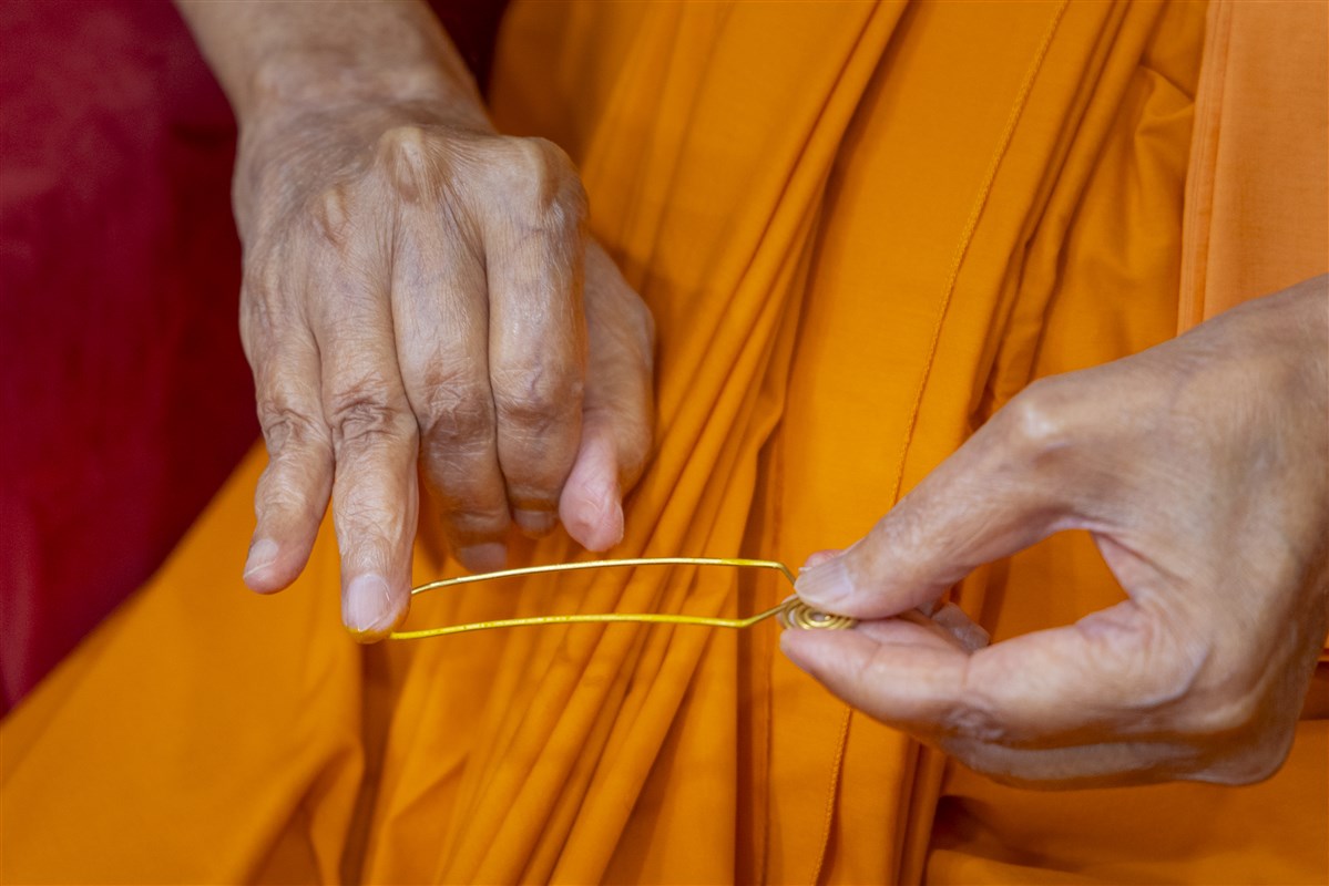 Swamishri prepares to turn the mala in his daily puja