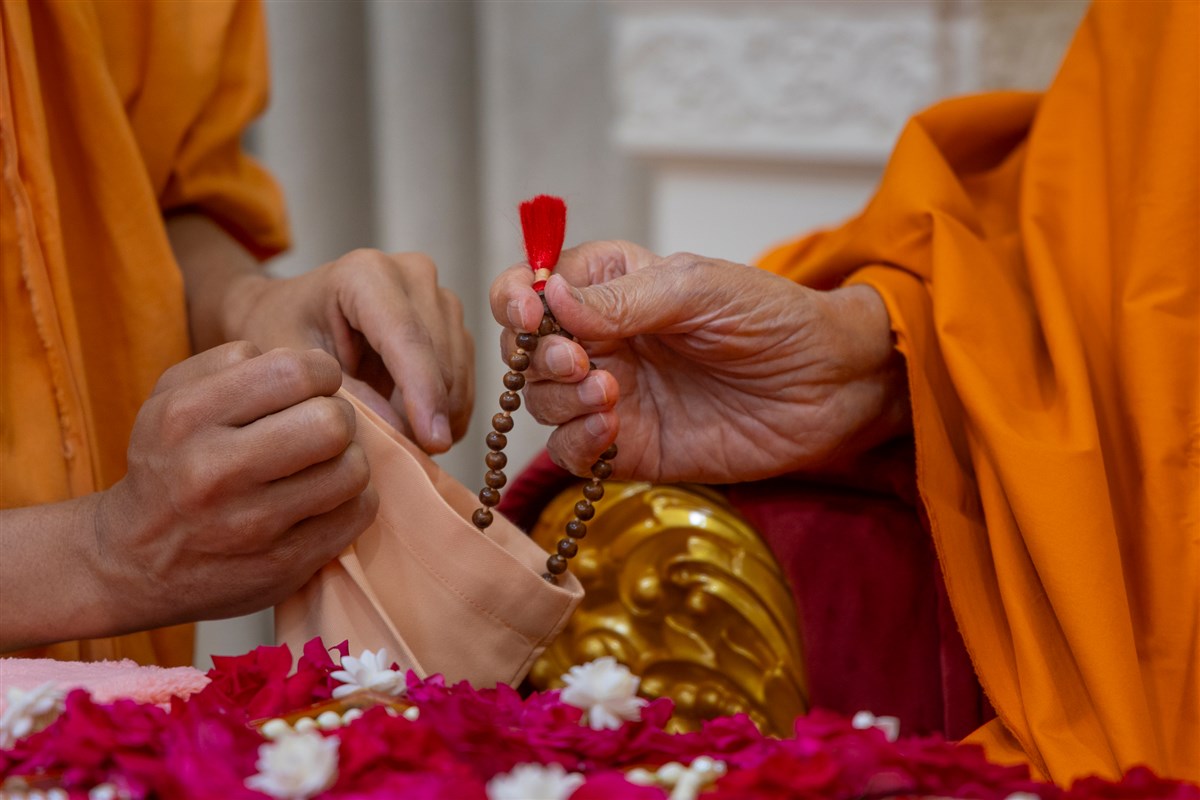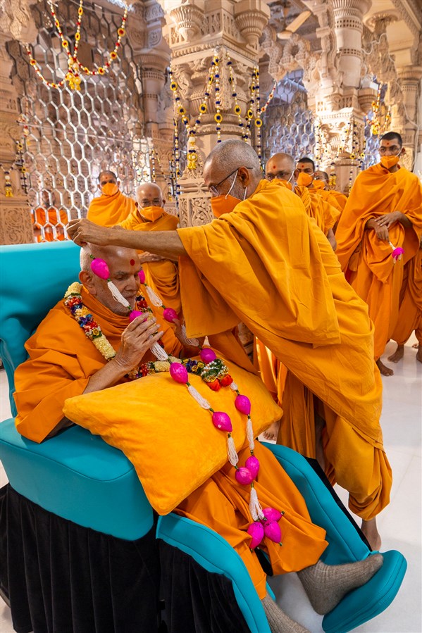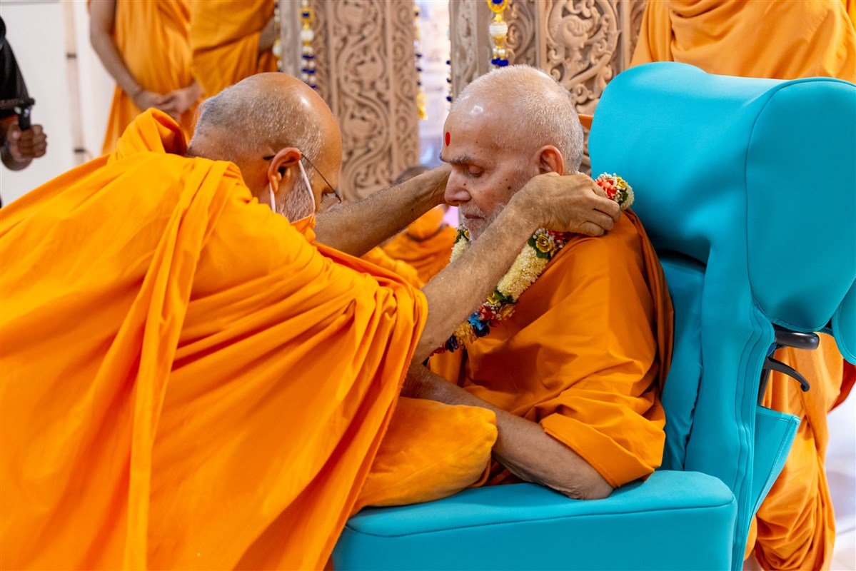 A swami honors Swamishri with a garland