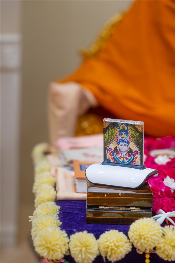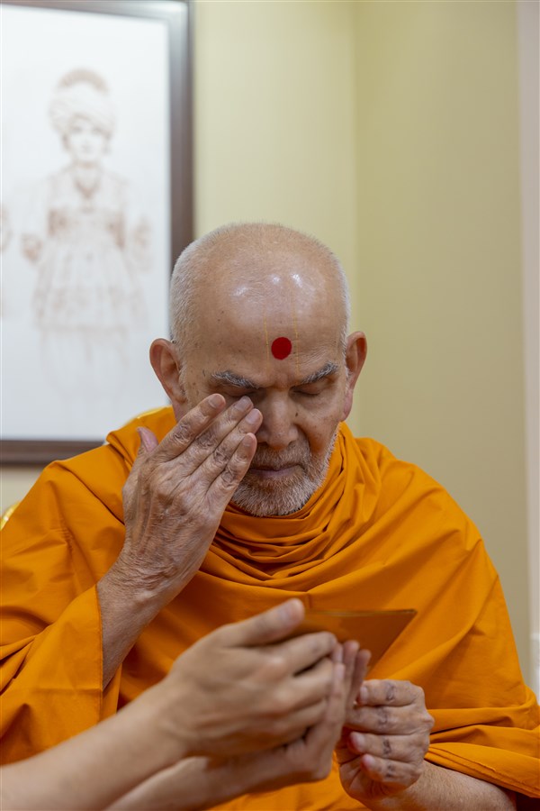 Swamishri places a mirror in his daily puja