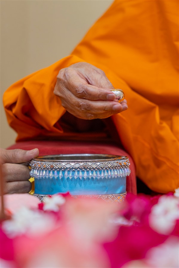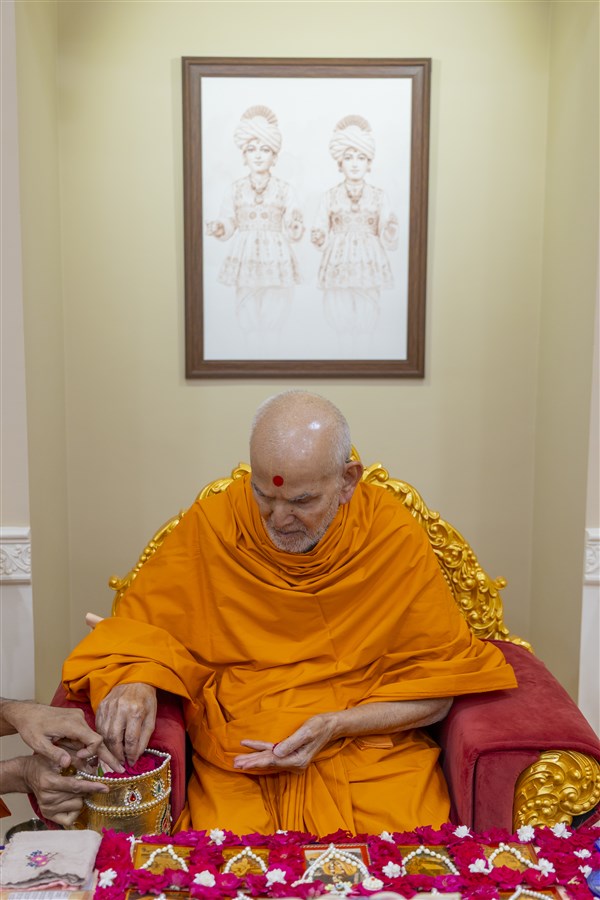 Swamishri adds flowers to the sanctified water