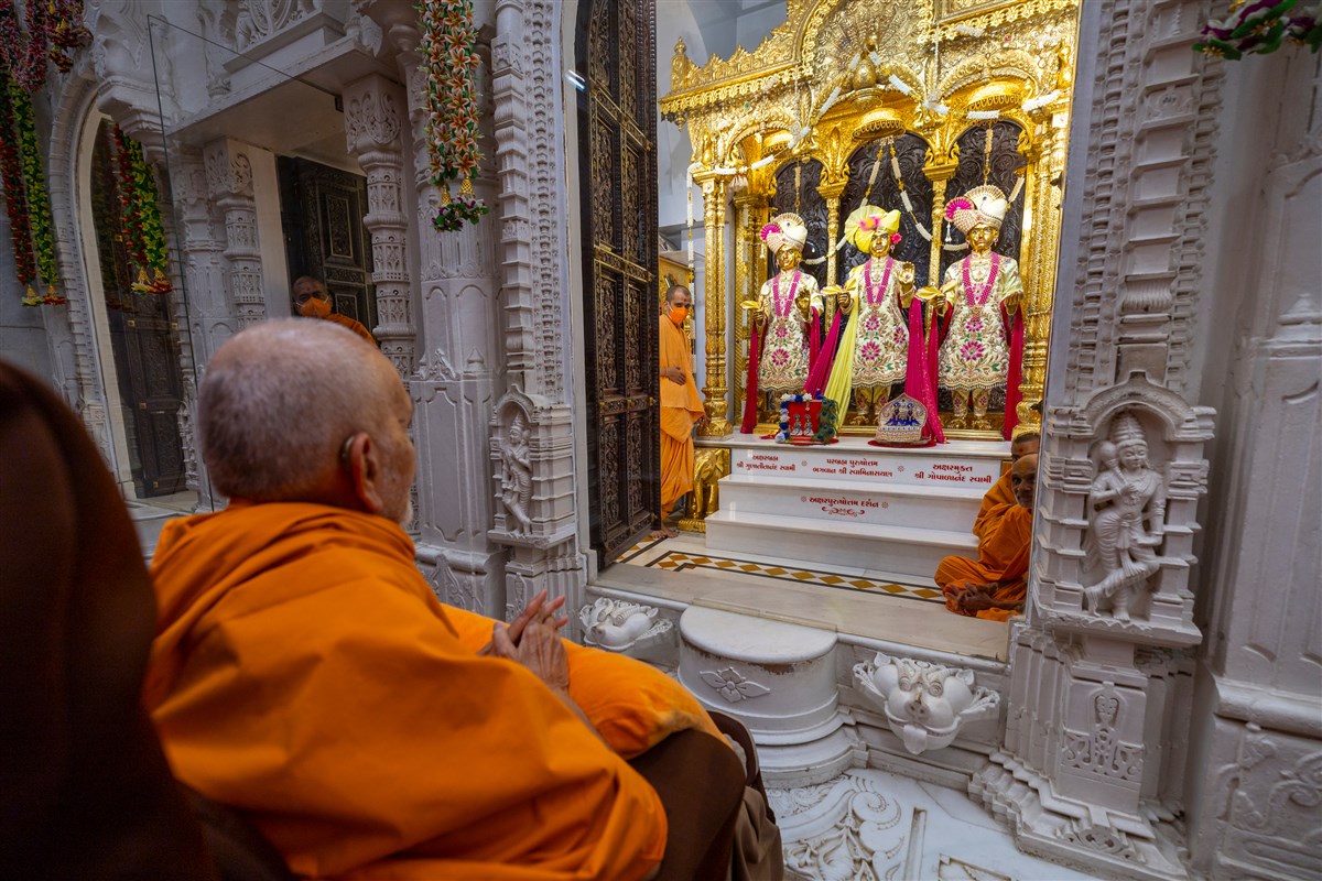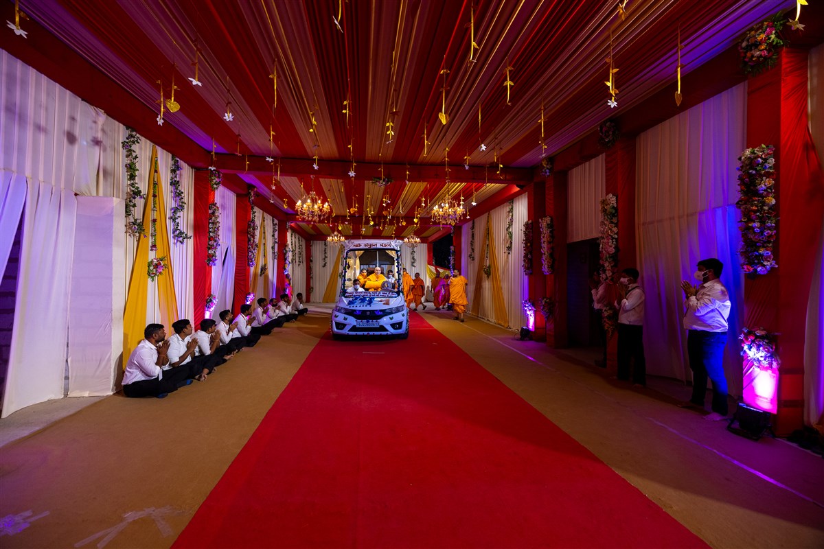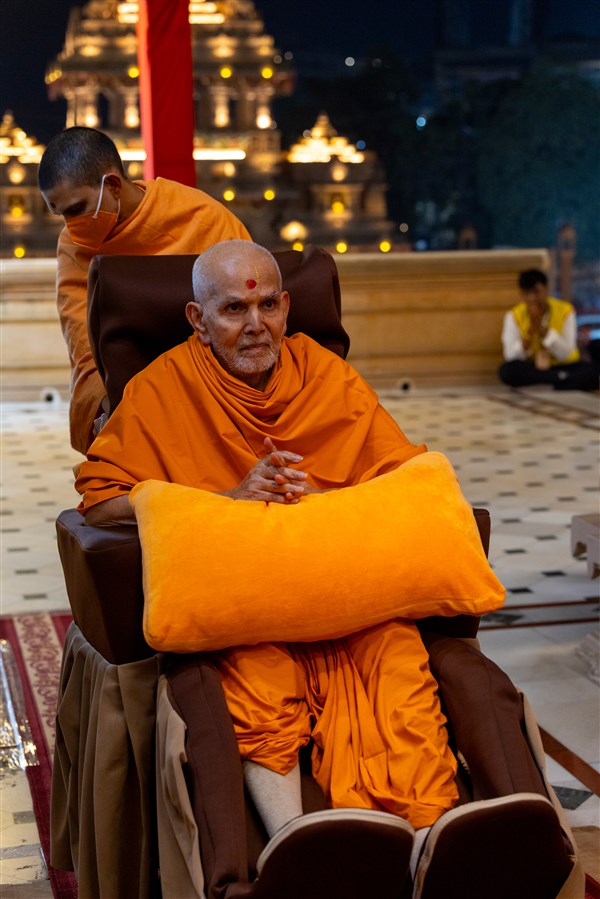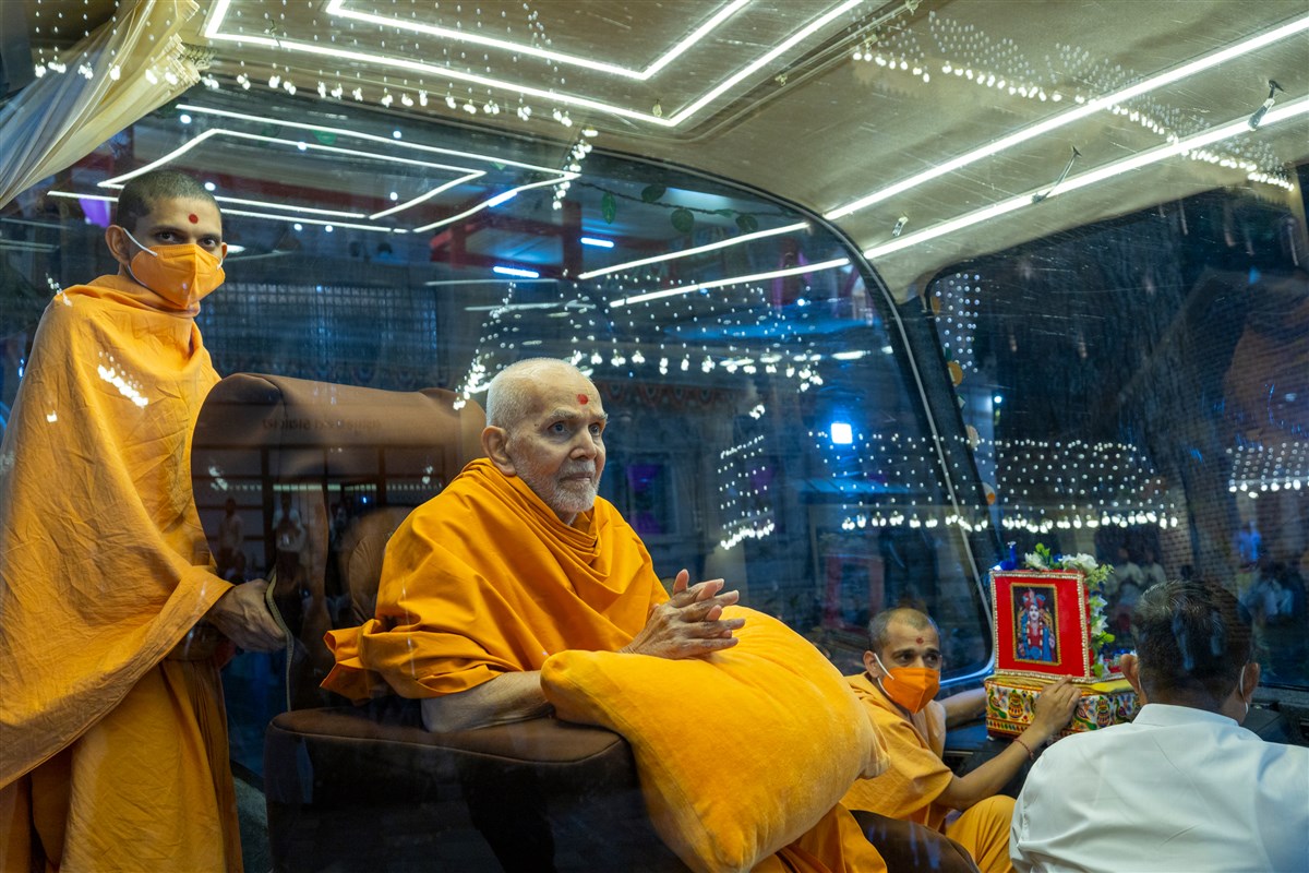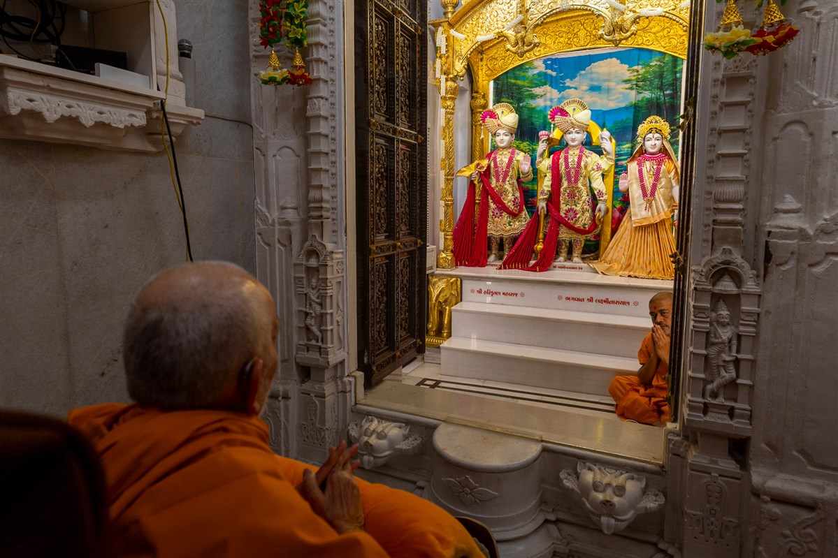 Swamishri arrives for Thakorji's darshan in the evening