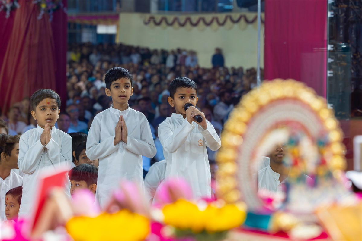 Children lead everyone in reciting the sadhana mantra and daily prayer in Swamishri's puja