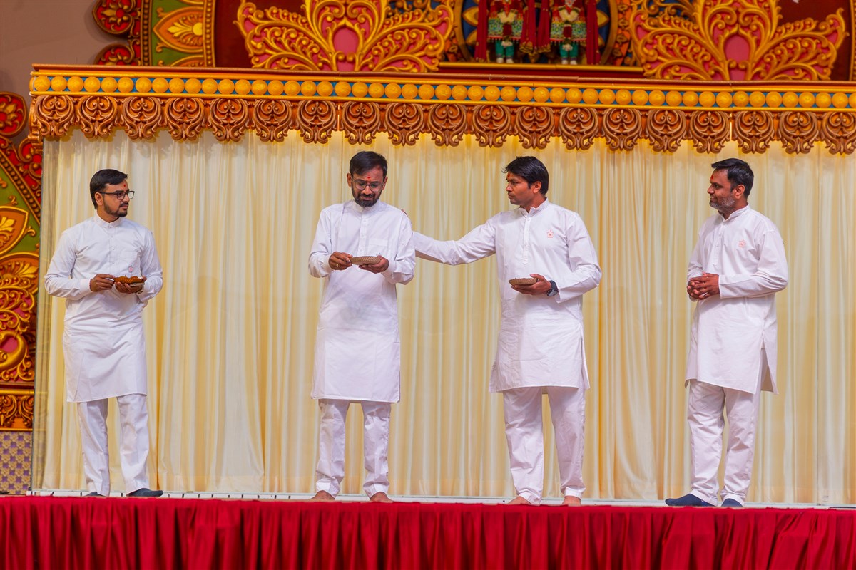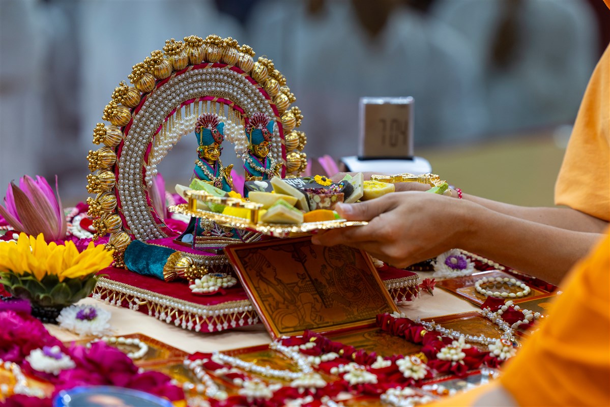 Swamishri offers thal to Shri Harikrishna Maharaj and Shri Gunatitanand Swami Maharaj