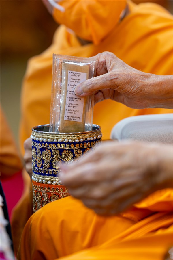 Swamishri sanctifies water with the holy relics of Bhagwan Swaminarayan and the Guru Parampara