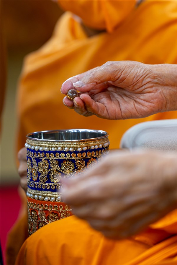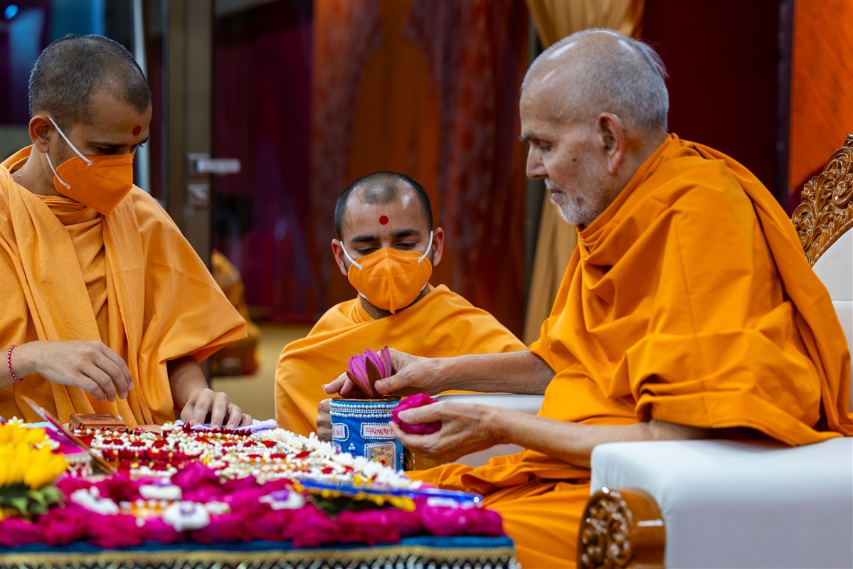 Swamishri adds flowers to the sanctified water