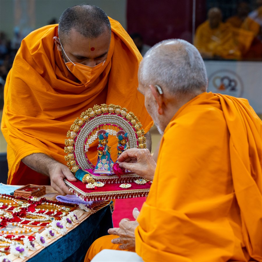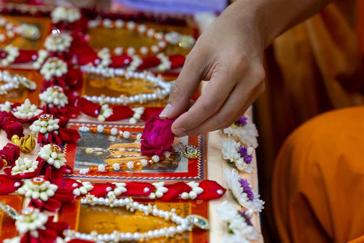 Swamishri offers a flower to Shri Harikrishna Maharaj and Shri Gunatitanand Swami Maharaj