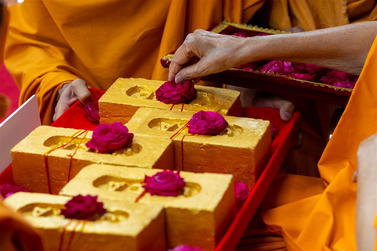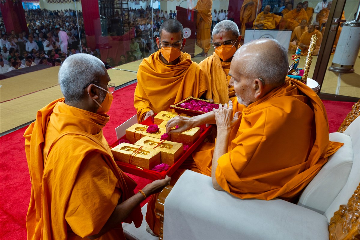 Swamishri sanctifies bricks to start construction of BAPS Shri Swaminarayan Mandir, Gorwa-Panchvati, Vadodara