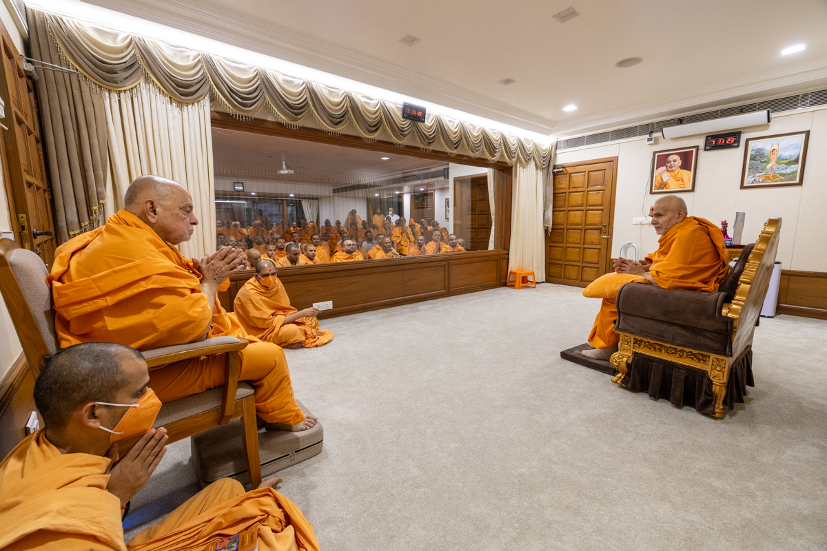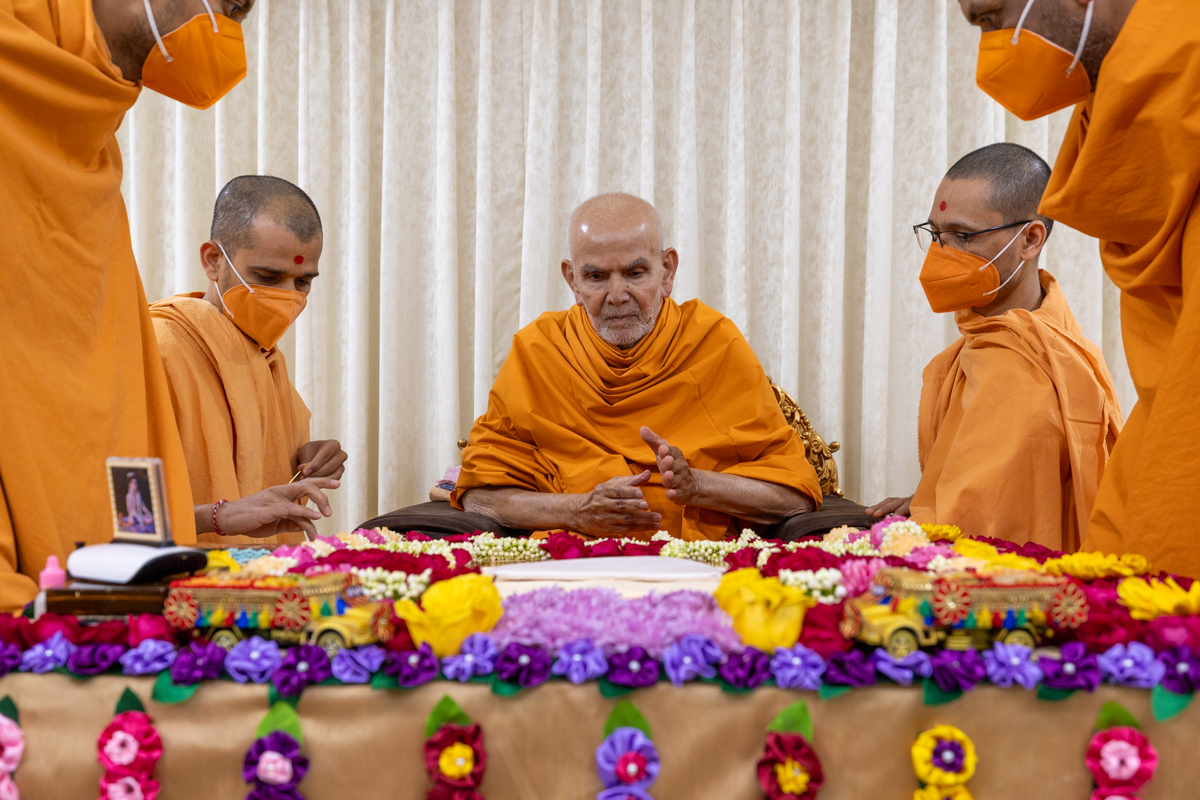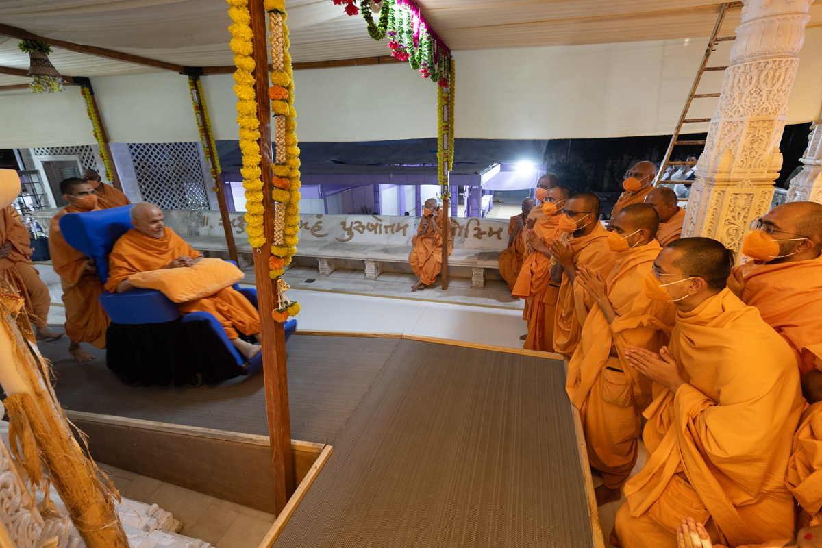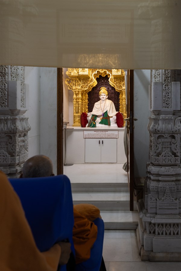 Swamishri arrives for Thakorji's darshan in the evening