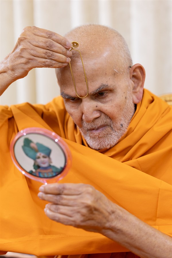 Swamishri applies a tilak on his forehead