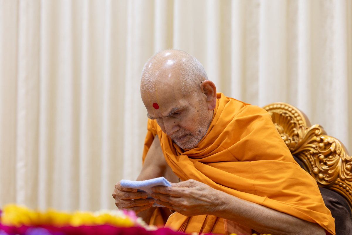 Swamishri clears loose kumkum from his forehead