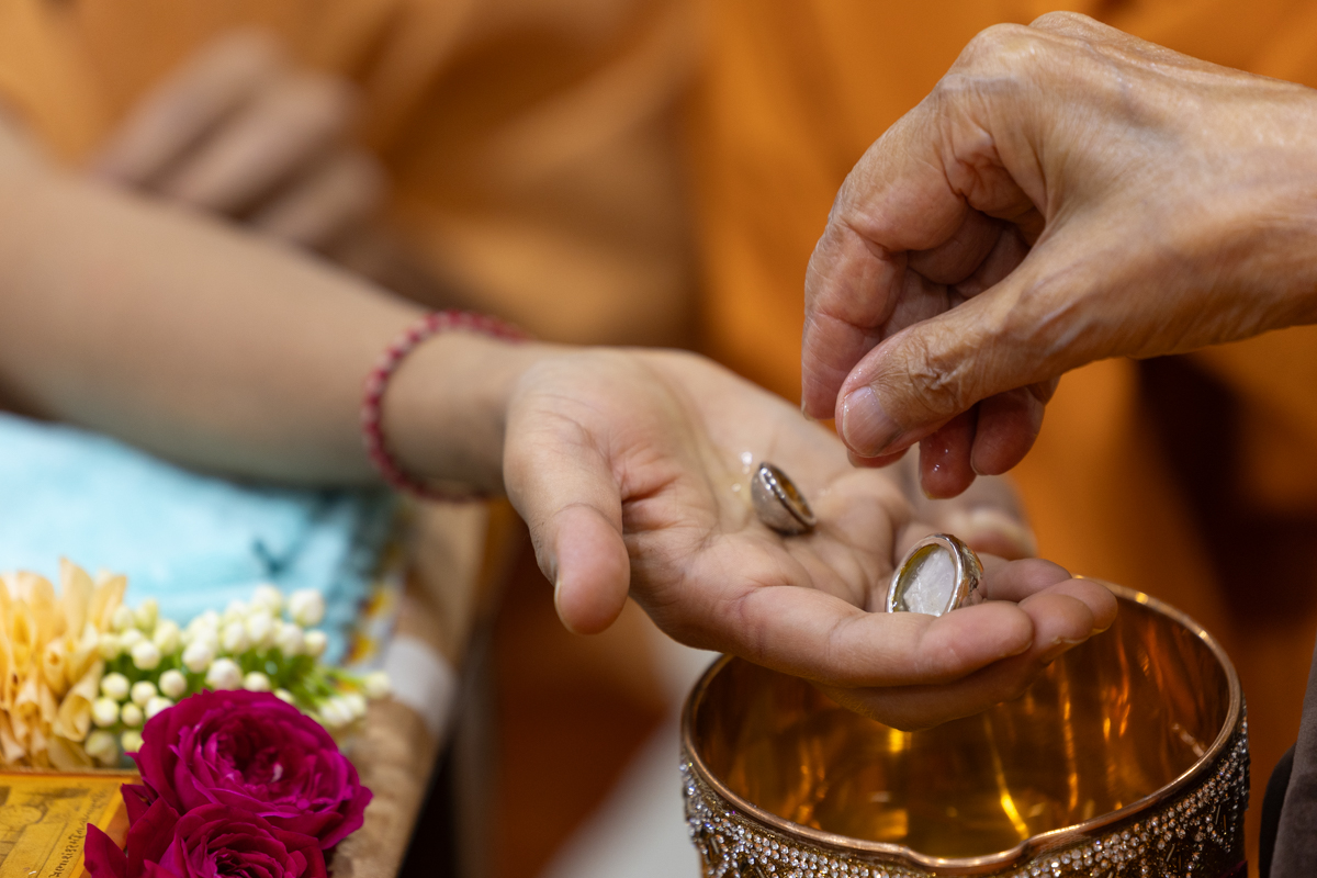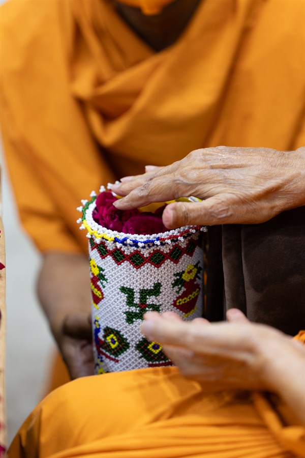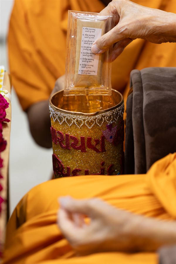 Swamishri adds flowers to the sanctified water
