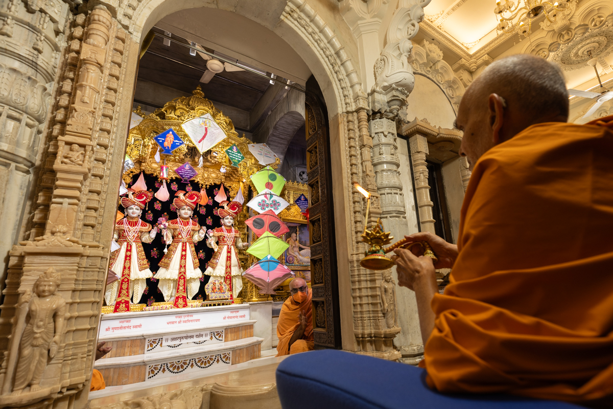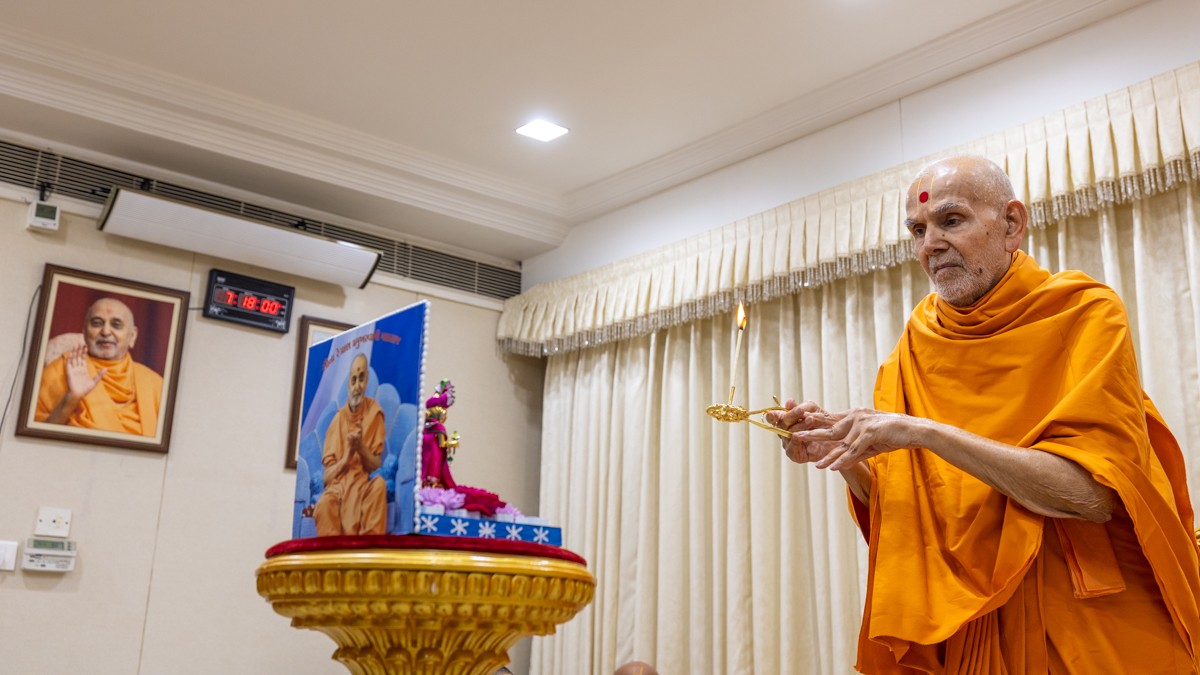 Swamishri performs the morning arti