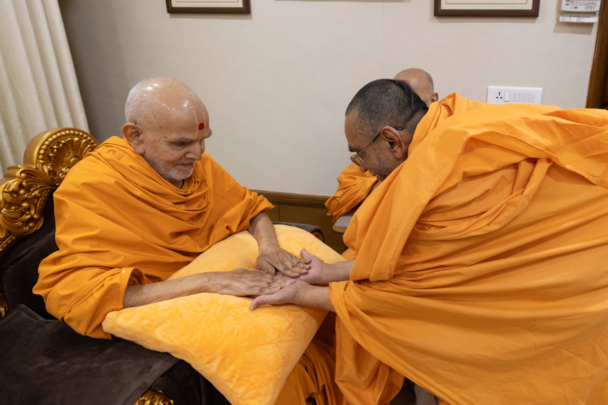 Pujya Ishwarcharan Swami greets Swamishri