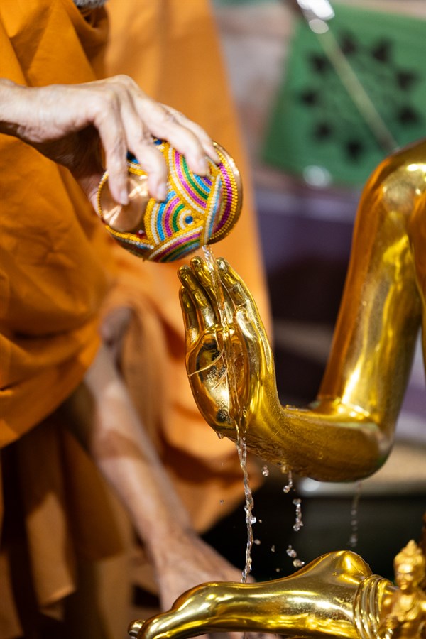 Swamishri sanctifies water with the holy relics of Bhagwan Swaminarayan and the Guru Parampara