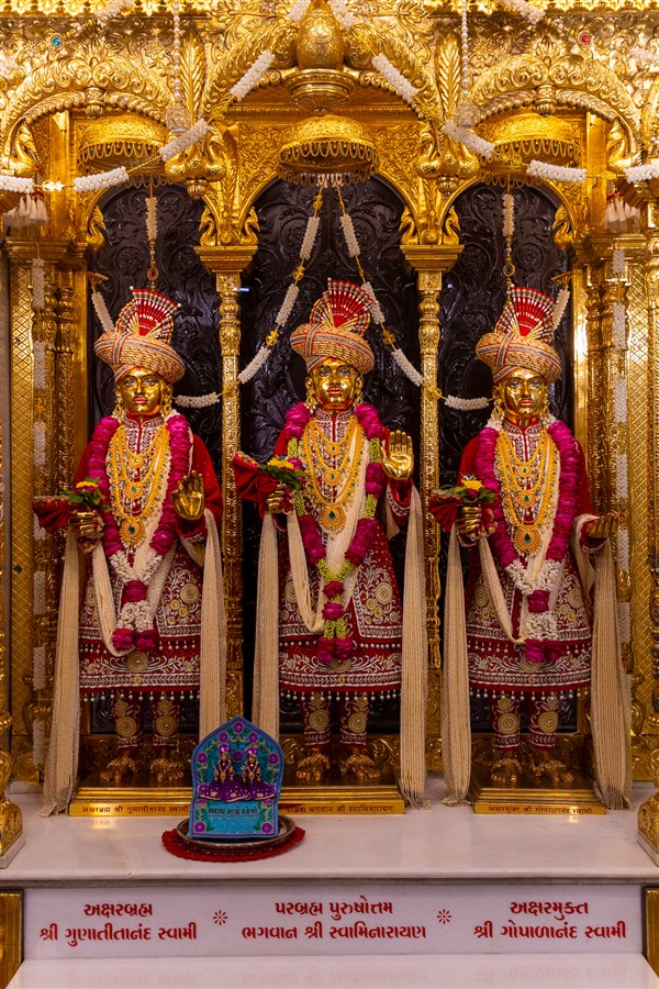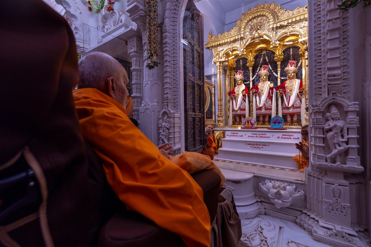 Swamishri engrossed in darshan of Bhagwan Swaminarayan, Aksharbrahma Gunatitanand Swami and Shri Gopalanand Swami