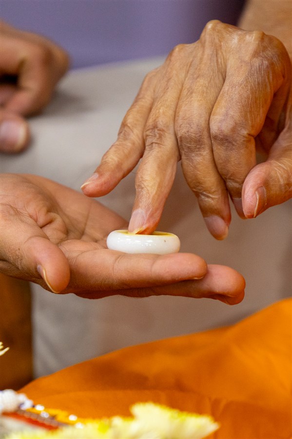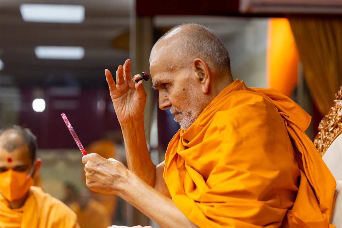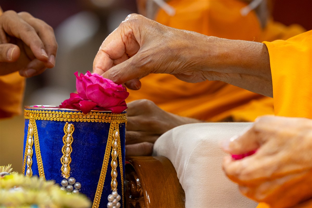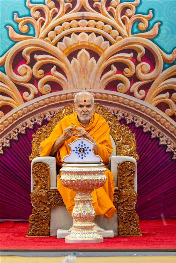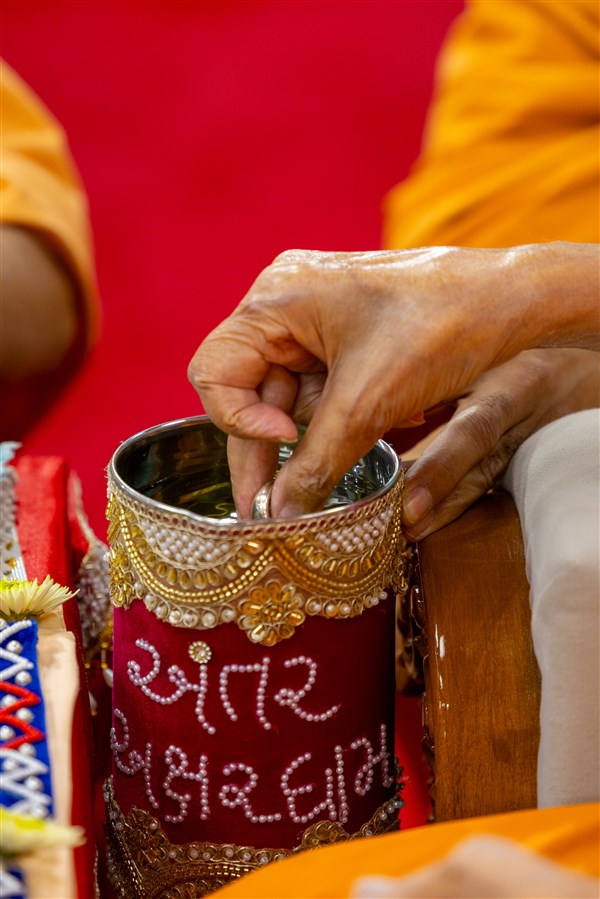 Swamishri sanctifies water with the holy relics of Bhagwan Swaminarayan and the Guru Parampara