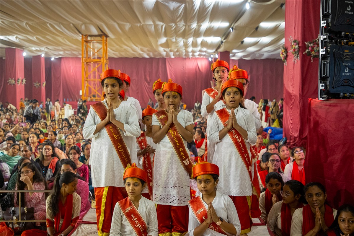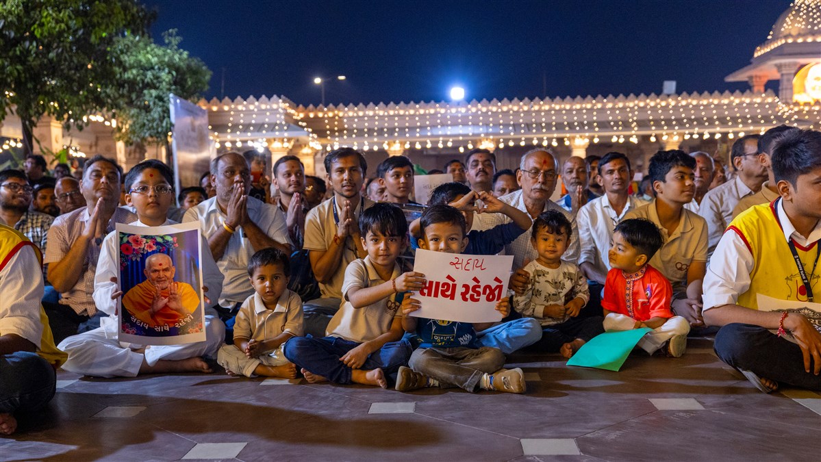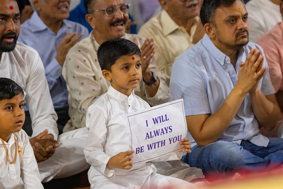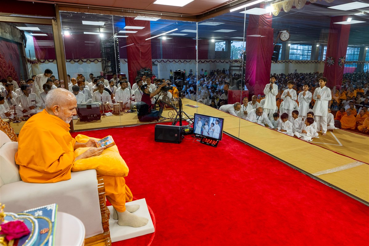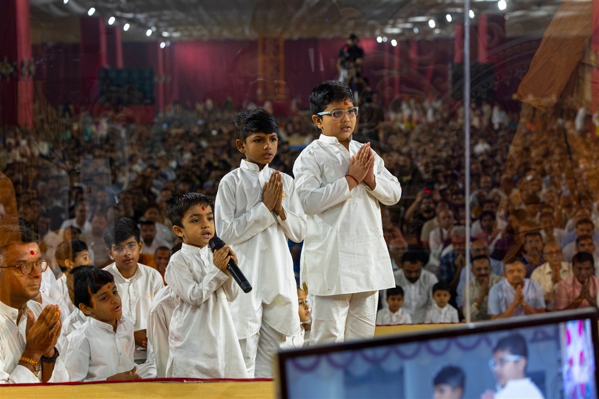 Balaks lead everyone in reciting the sadhana mantra and daily prayer in Swamishri's puja