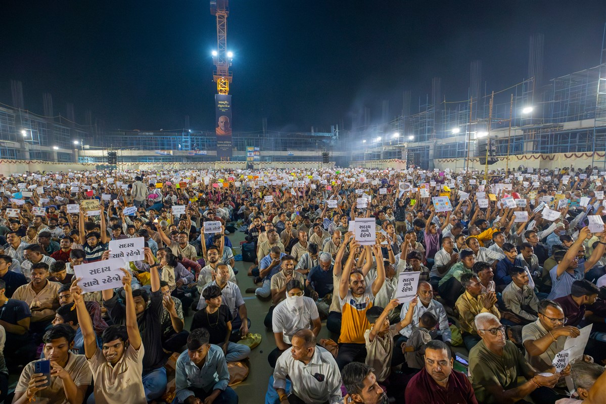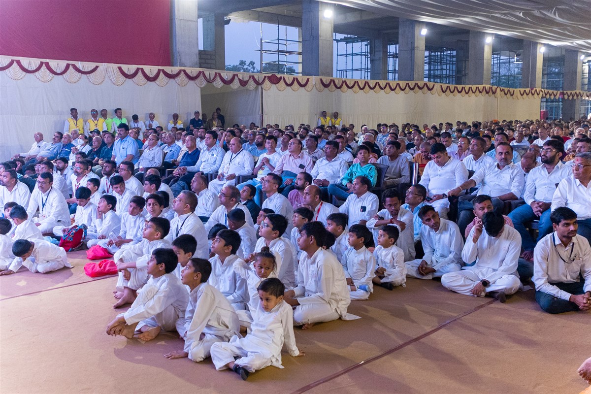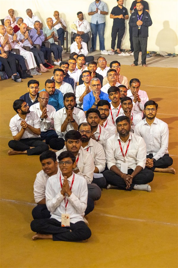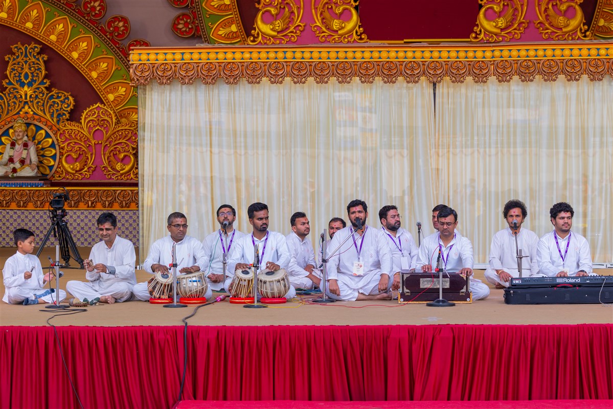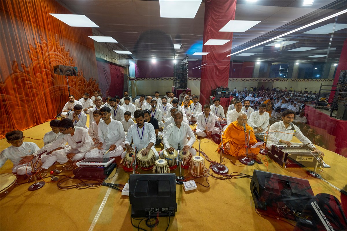 Yuvaks sing kirtans at the beginning of the 'Viday Din' assembly in the evening