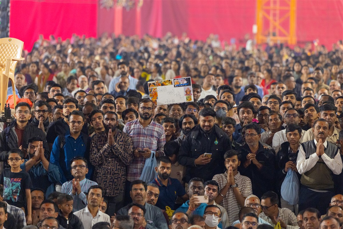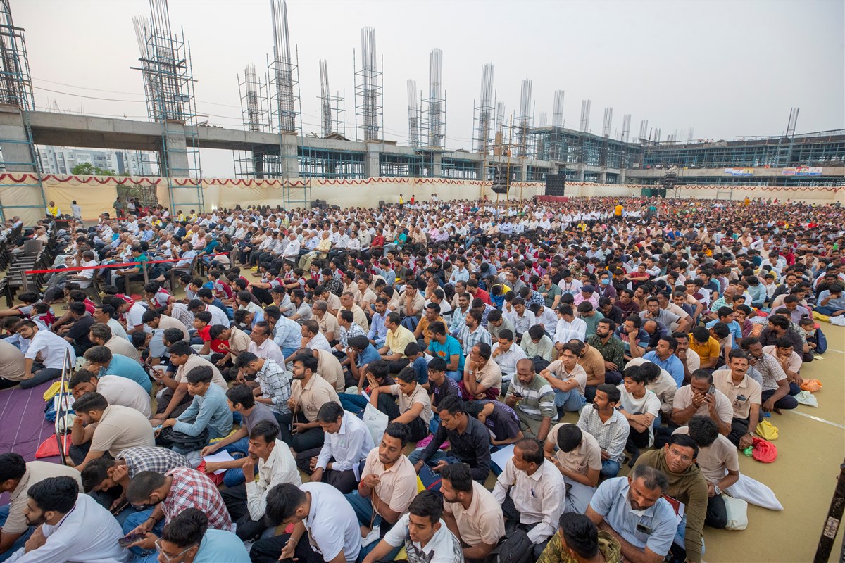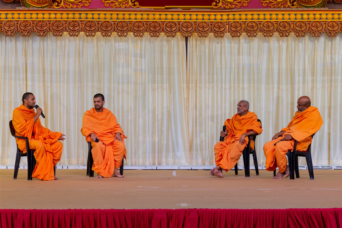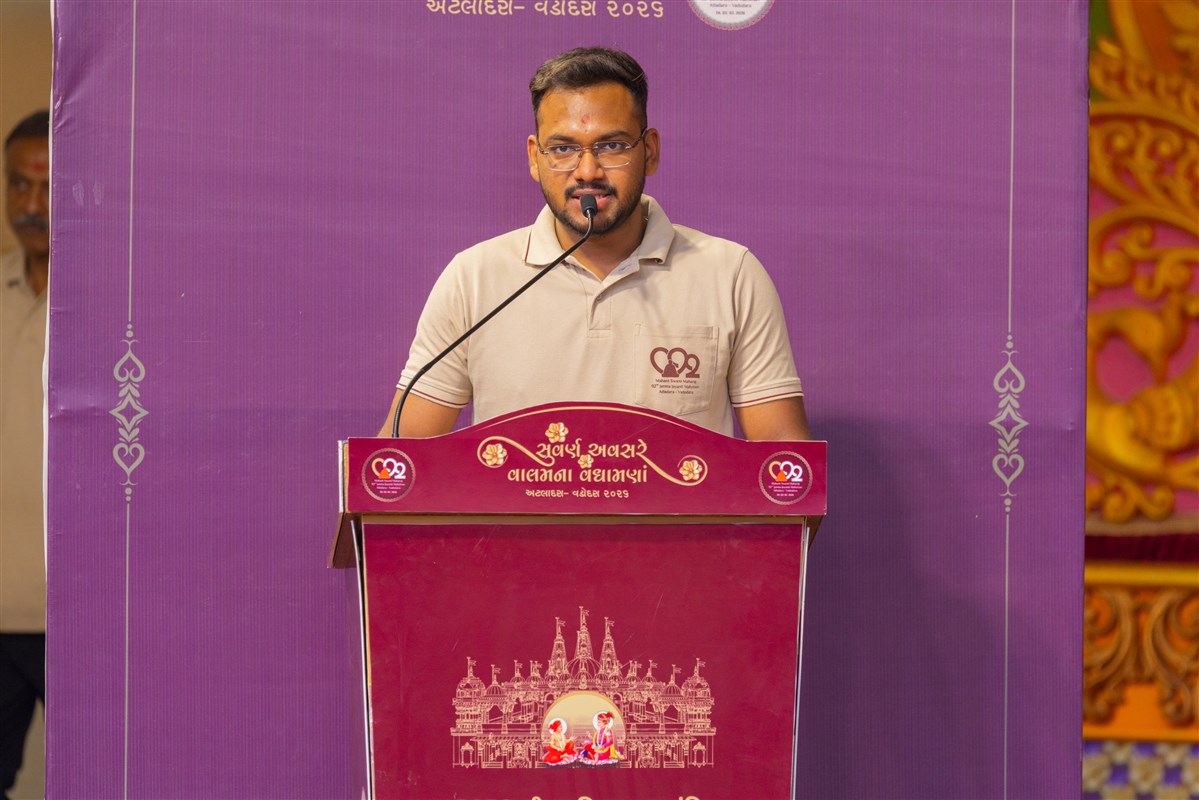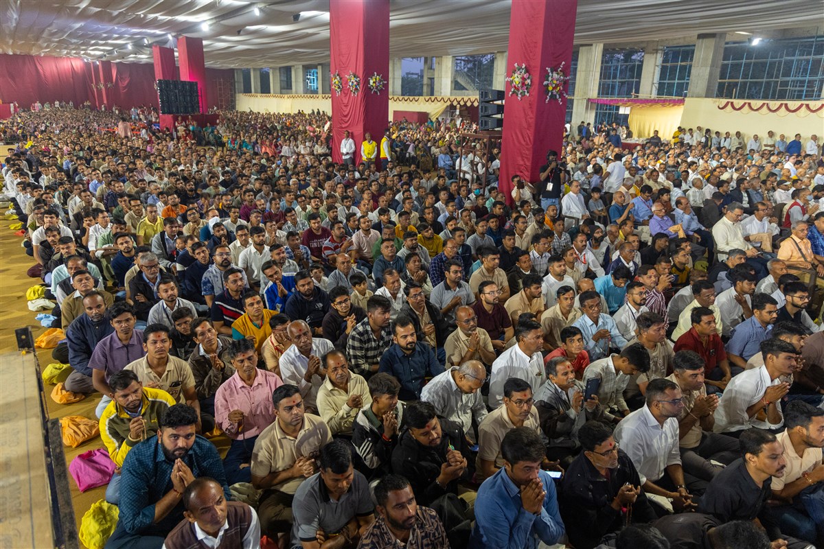 Yuvaks sing kirtans at the beginning of the 'Viday Din' assembly in the evening