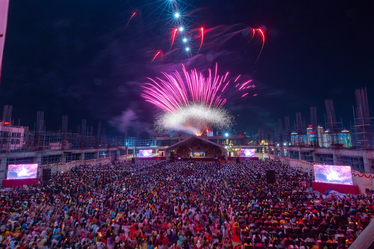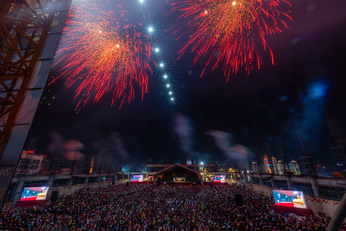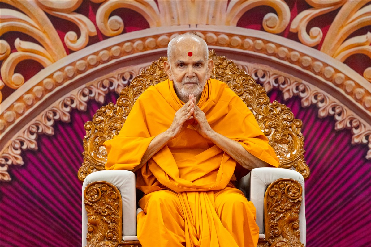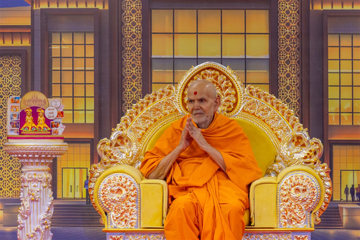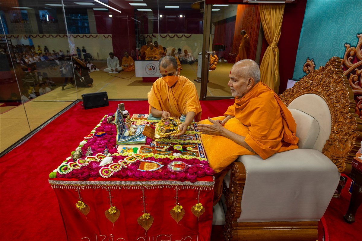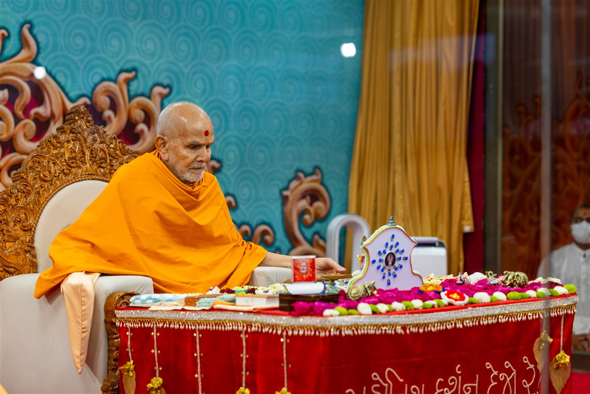 Swamishri offers thal to Shri Akshar-Purushottam Maharaj