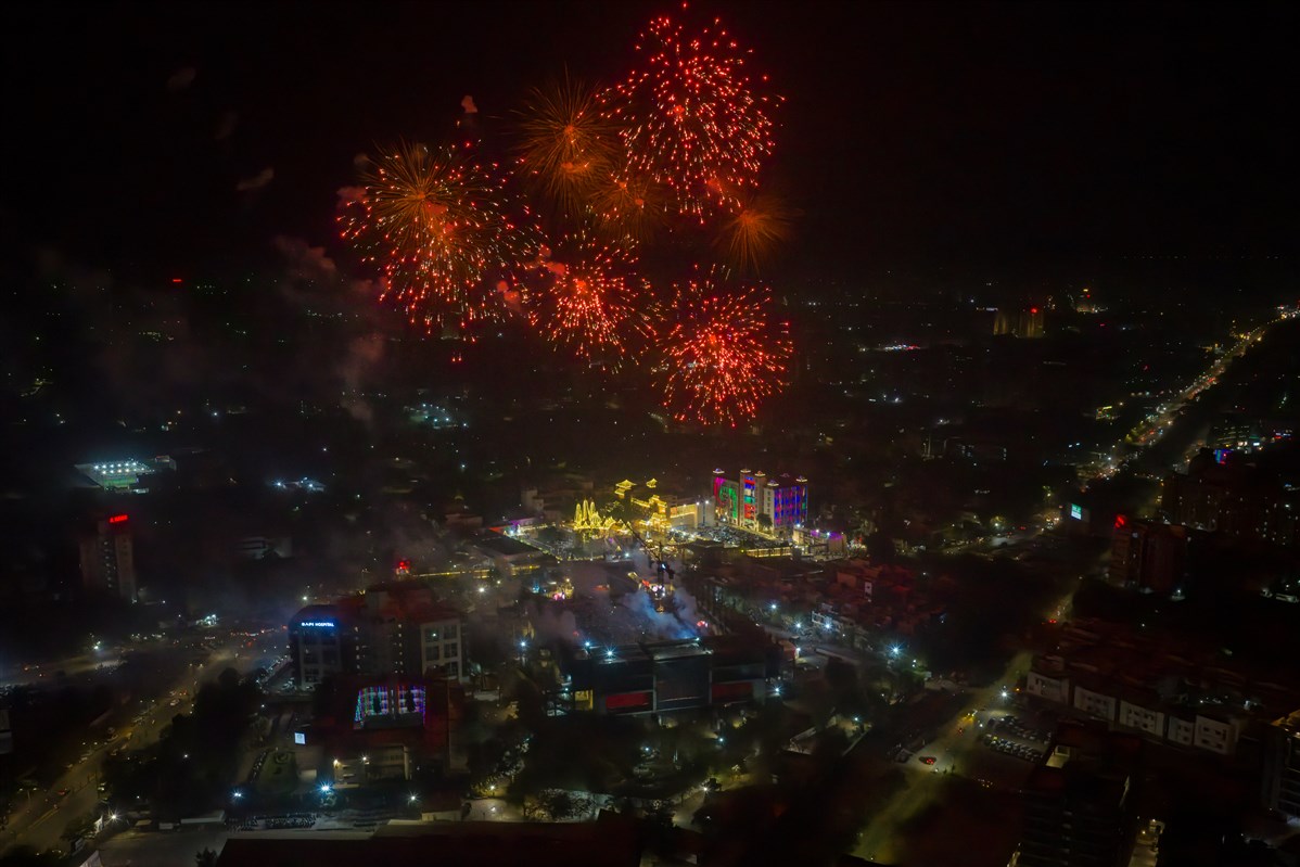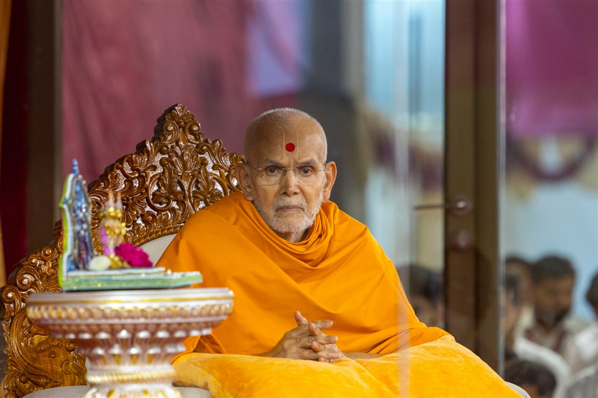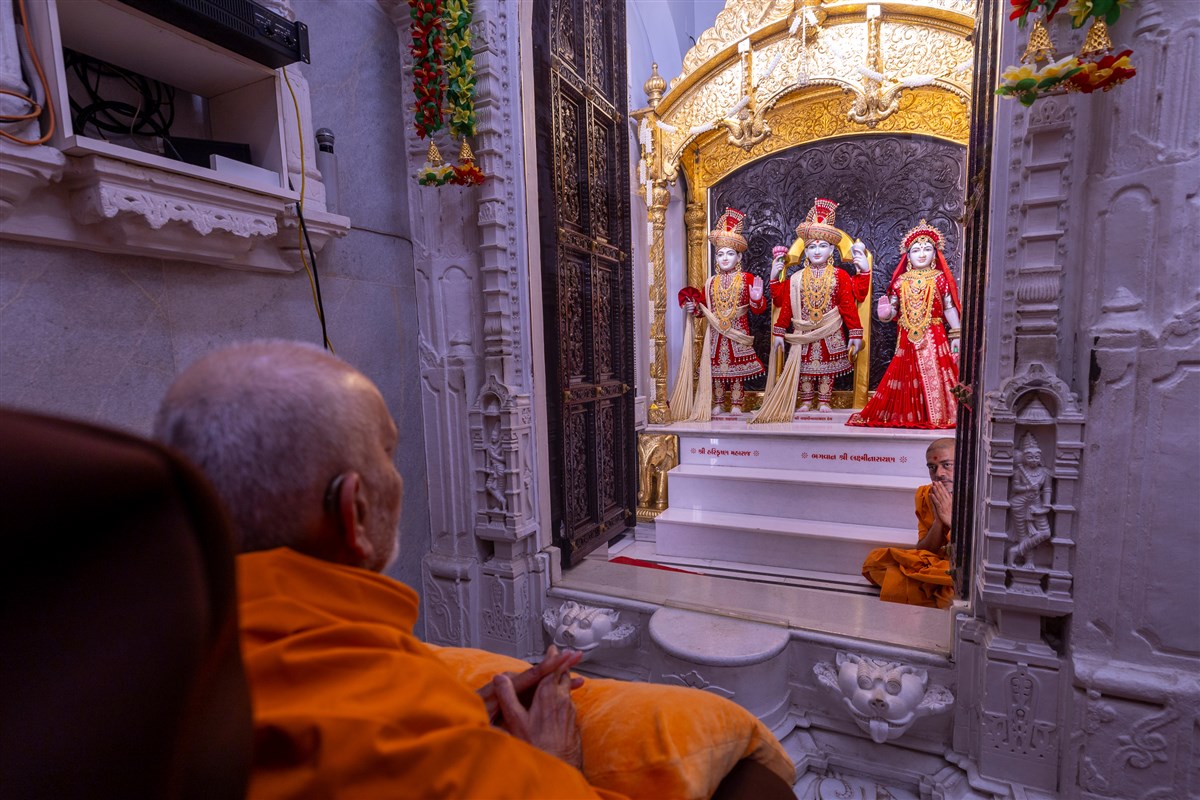 Swamishri engrossed in darshan of Shri Harikrishna Maharaj and Shri Lakshmi-Narayan Bhagwan