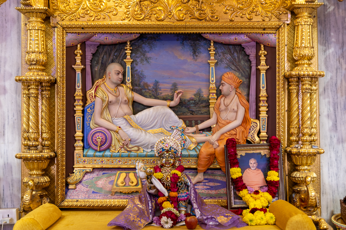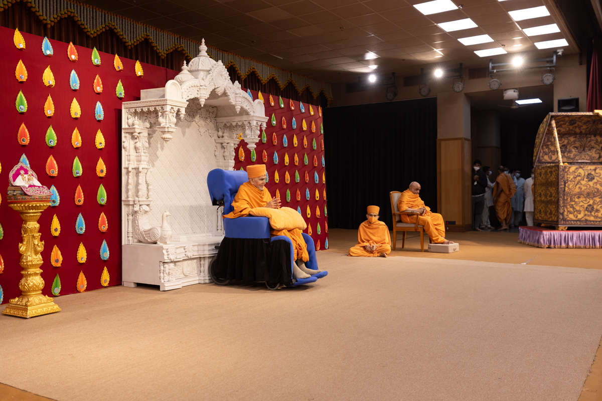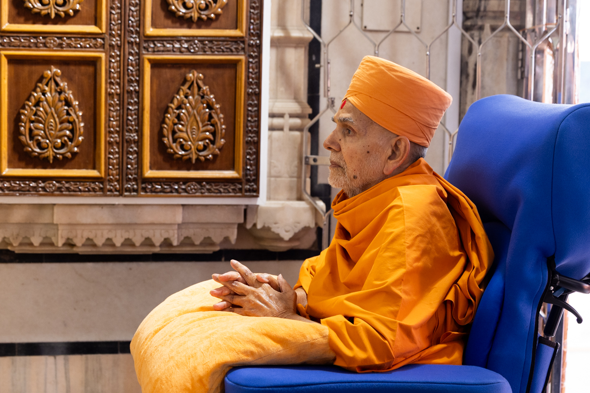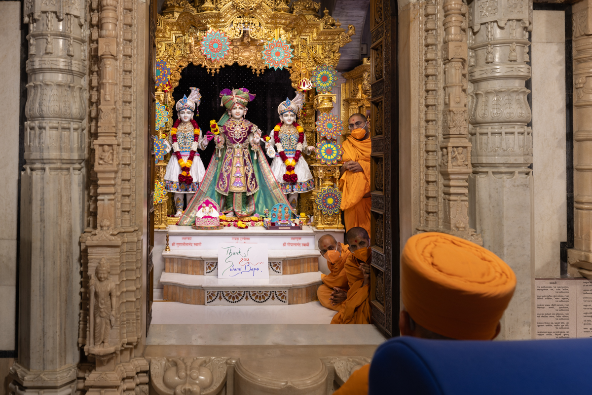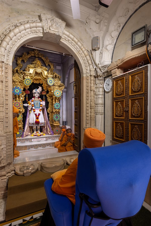Swamishri arrives for Thakorji's darshan before he departs from Ahmedabad