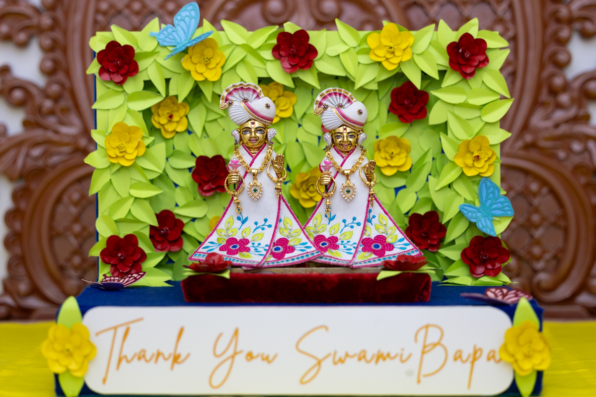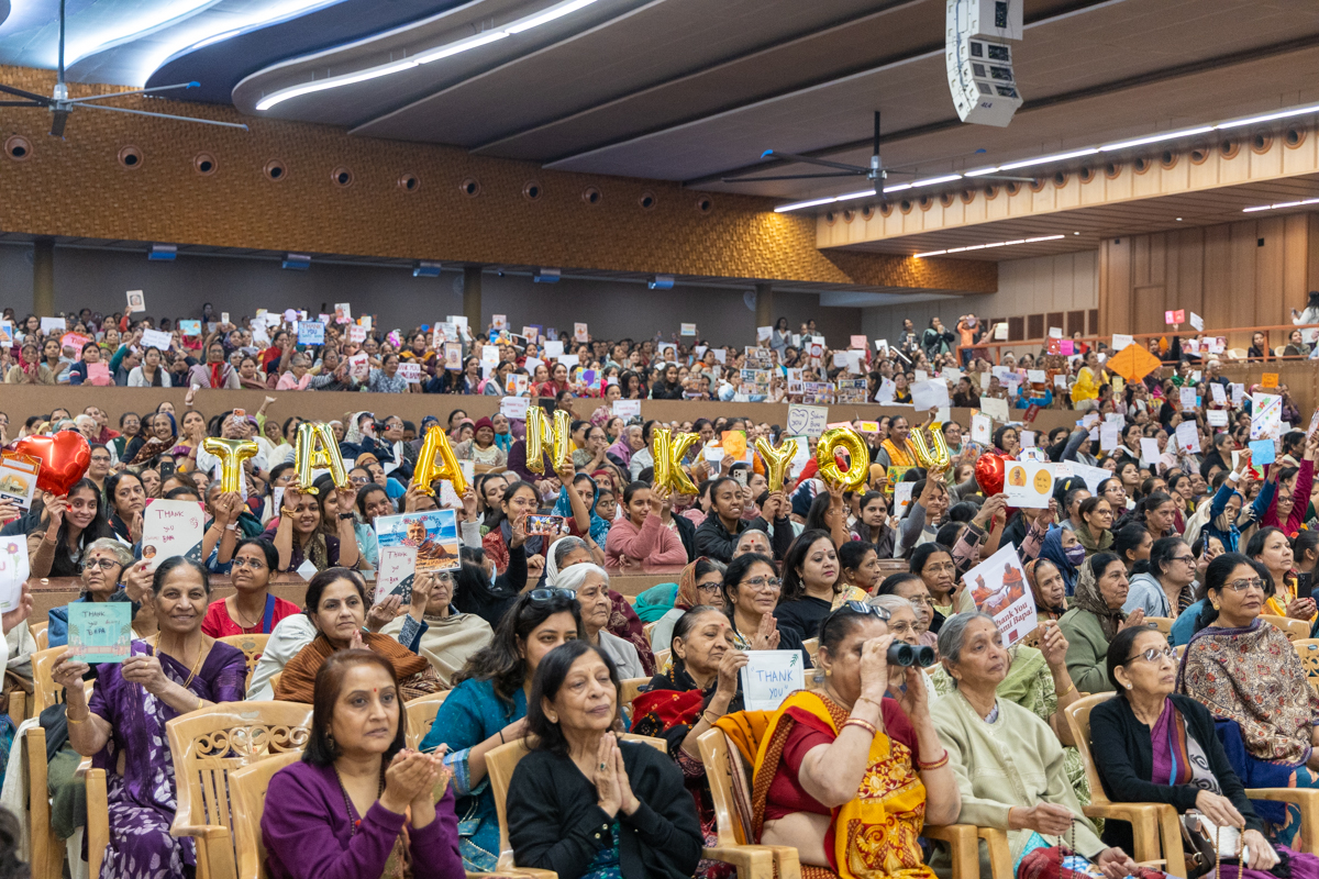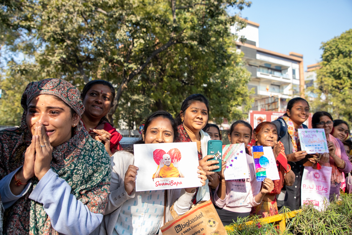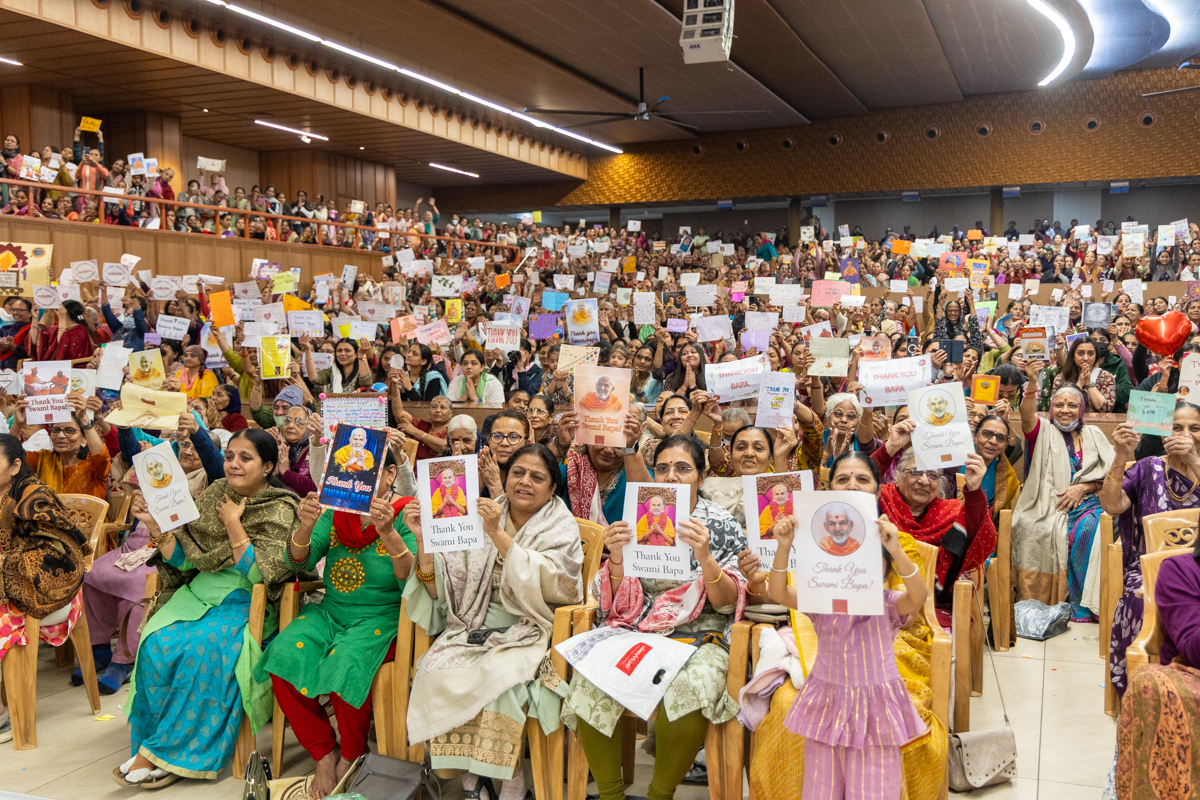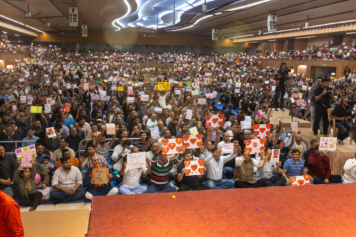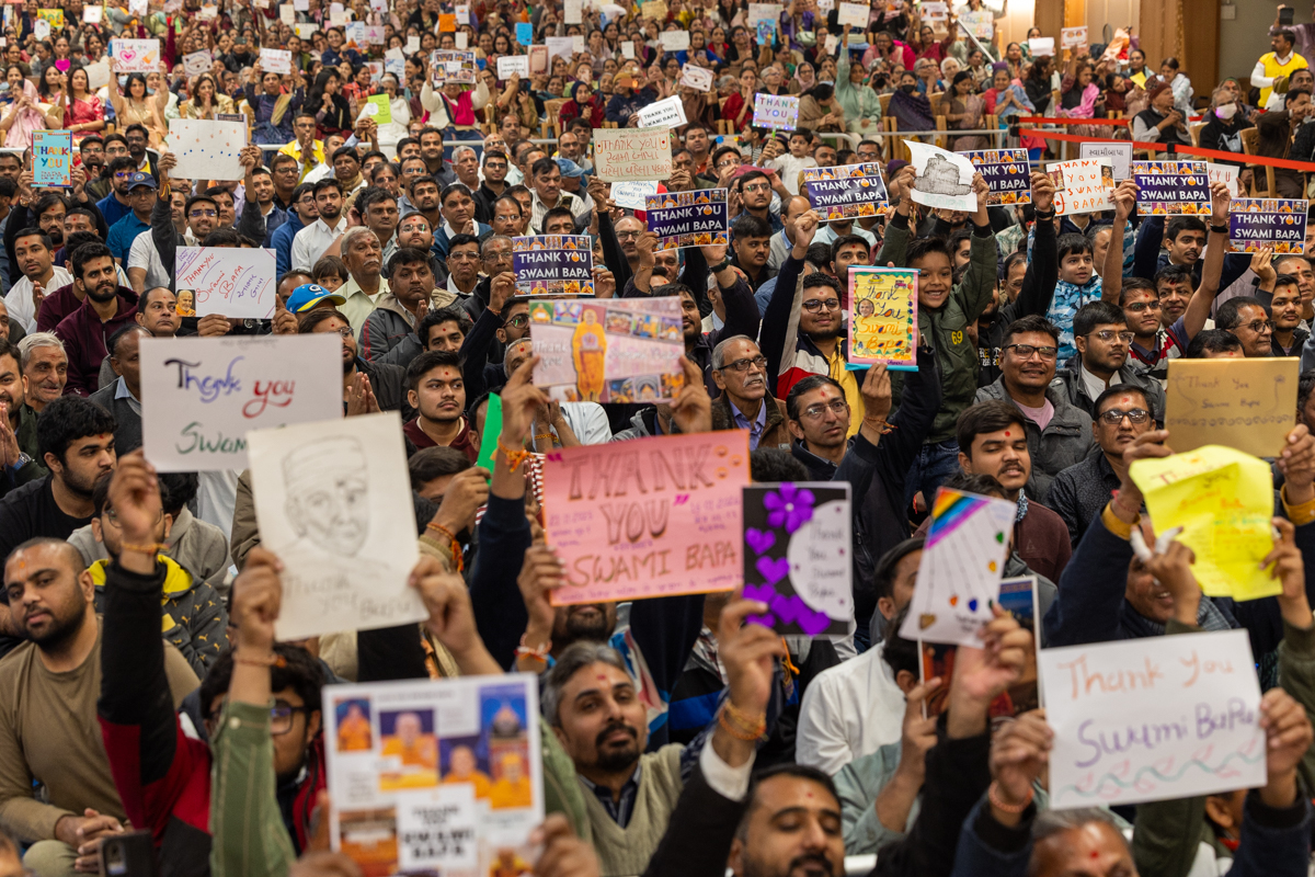 Devotees display their 'Thank You, Swami Bapa' cards to Swamishri
