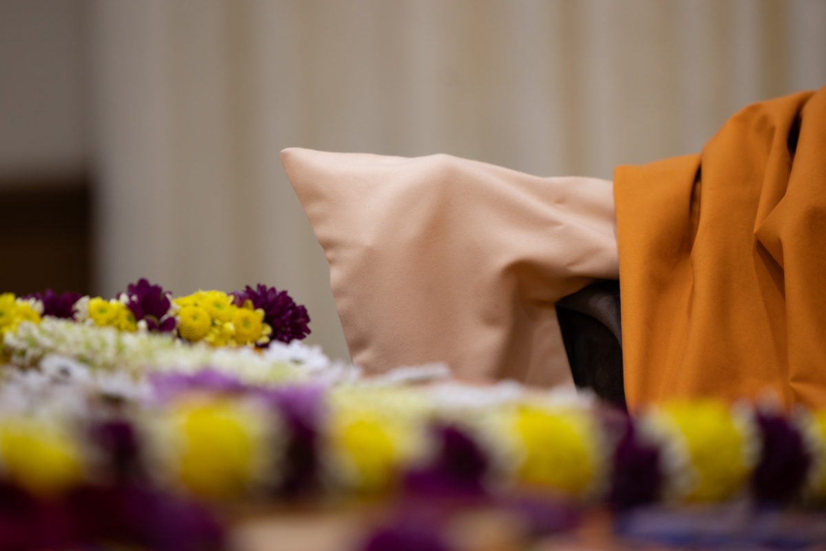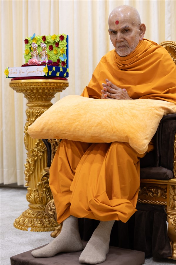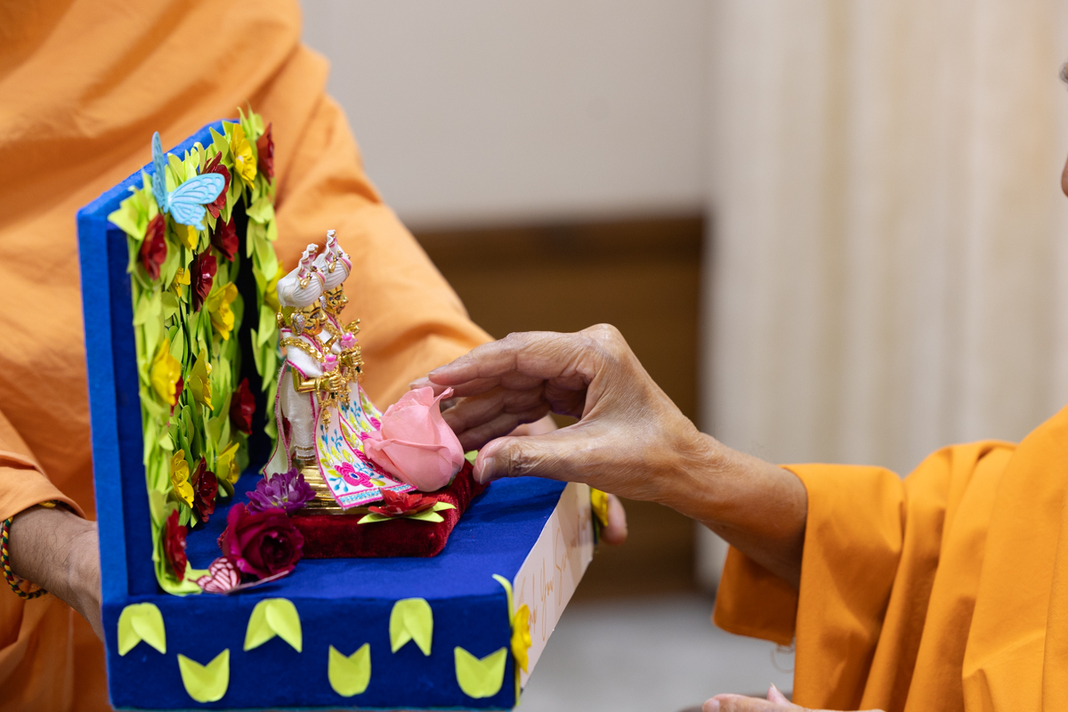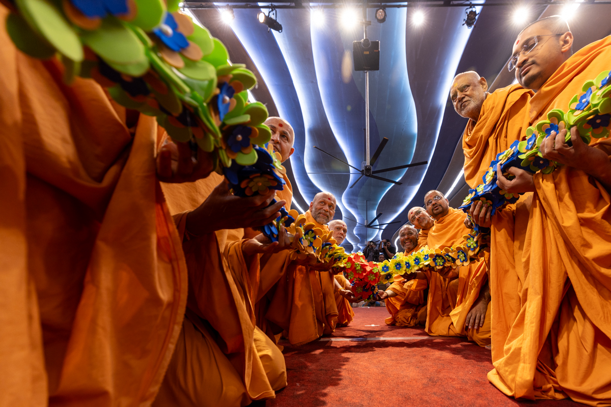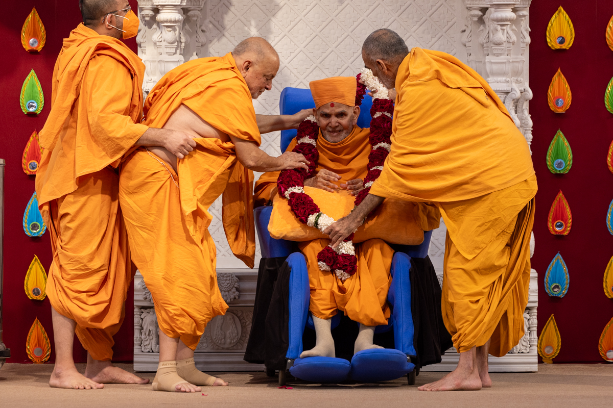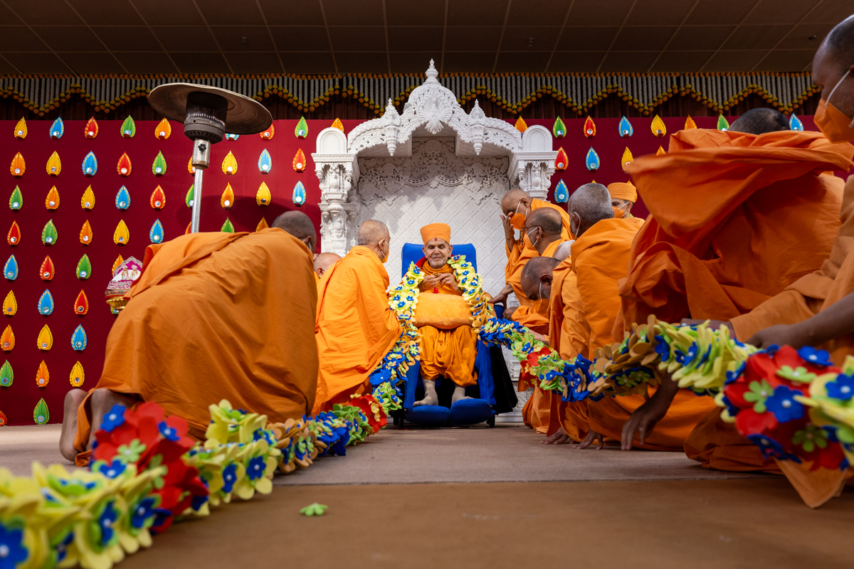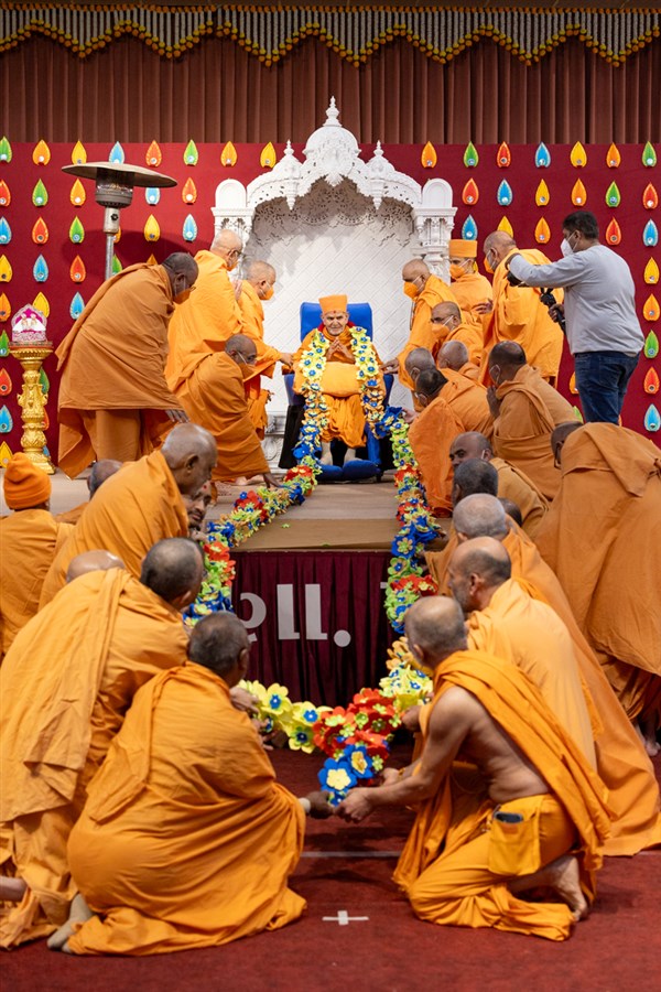Swamis honor Swamishri with a garland