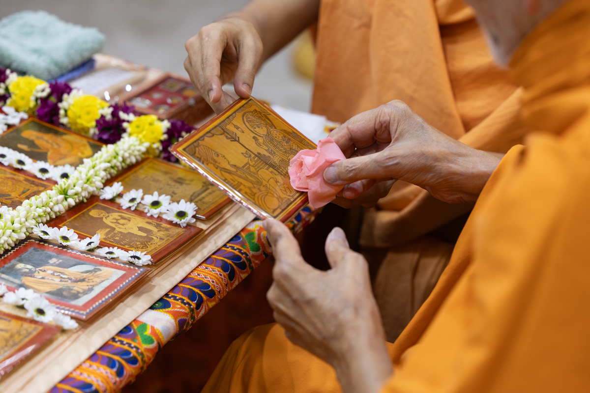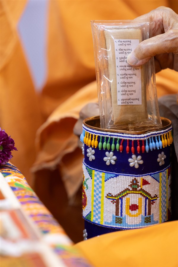 Swamishri sanctifies water with the holy relics of Bhagwan Swaminarayan and the Guru Parampara