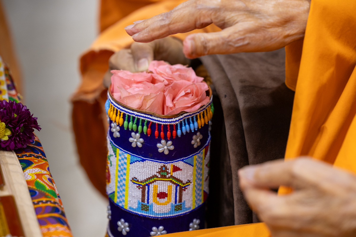 Swamishri adds flowers to the sanctified water