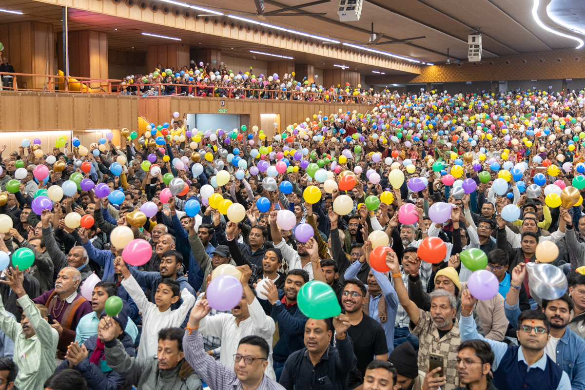 Swamis and devotees wave balloons