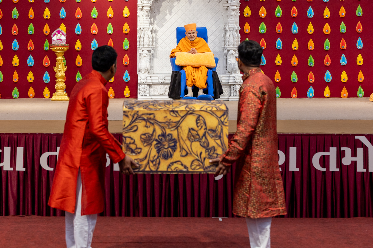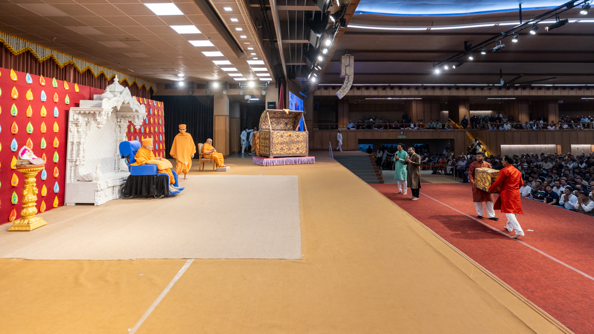 Devotees present a box to Swamishri