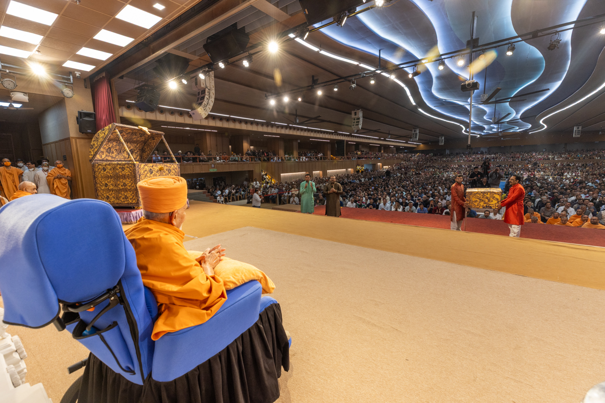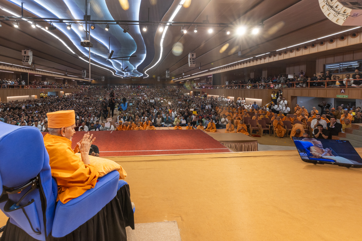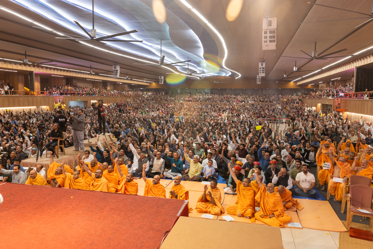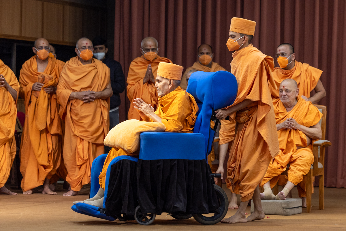 Swamishri greets all with folded hands during the assembly