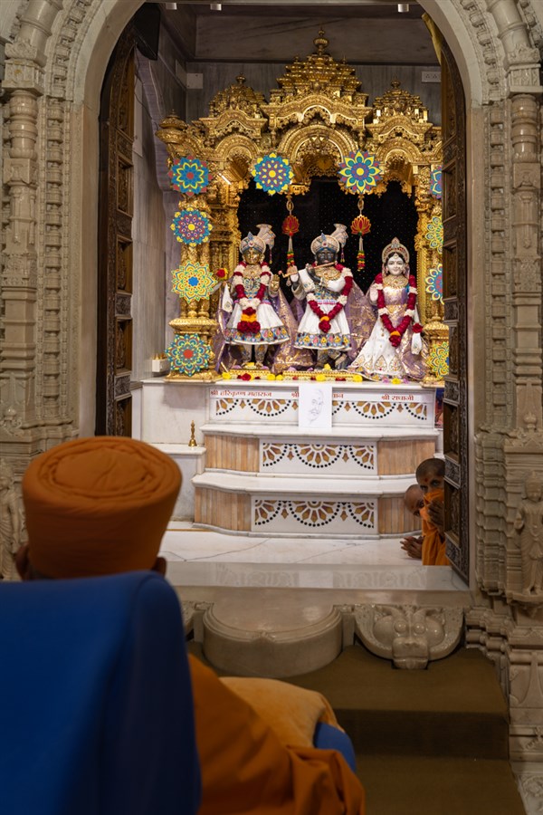 Swamishri engrossed in darshan of Shri Harikrishna Maharaj, Bhagwan Shri Krishna and Shri Radhaji