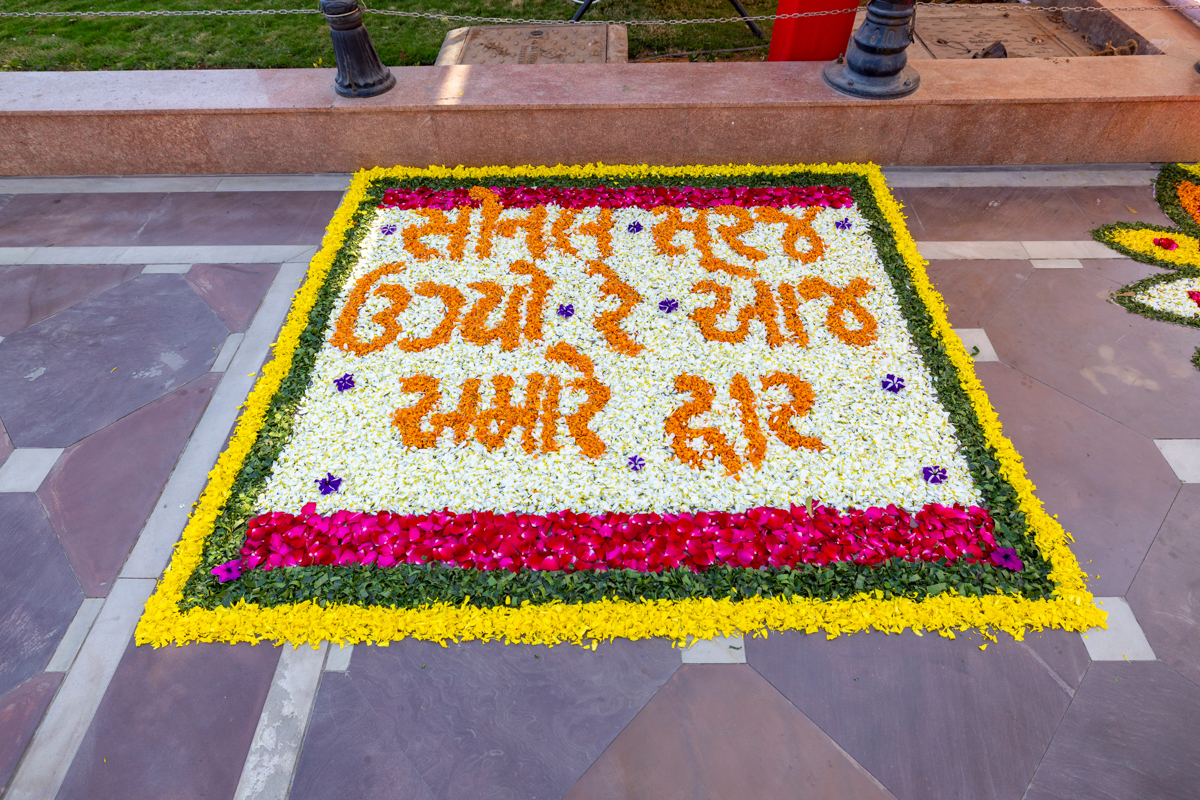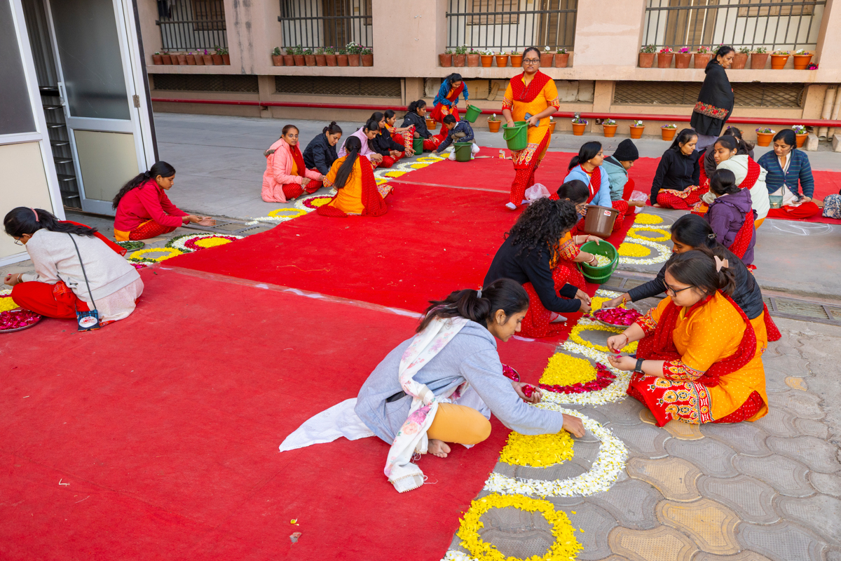 Yuvatis prepare rangoli of flower petals to welcome Swamishri