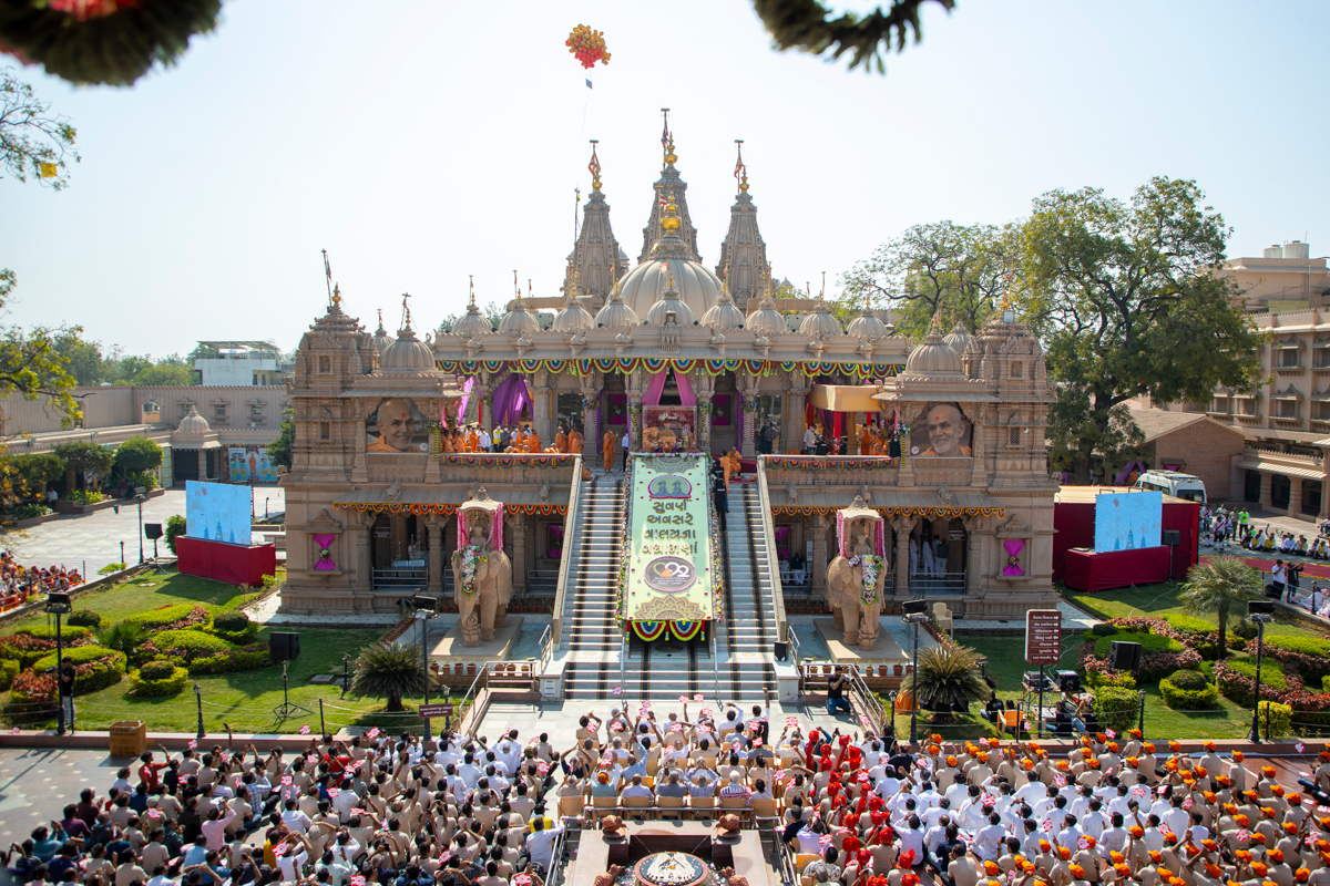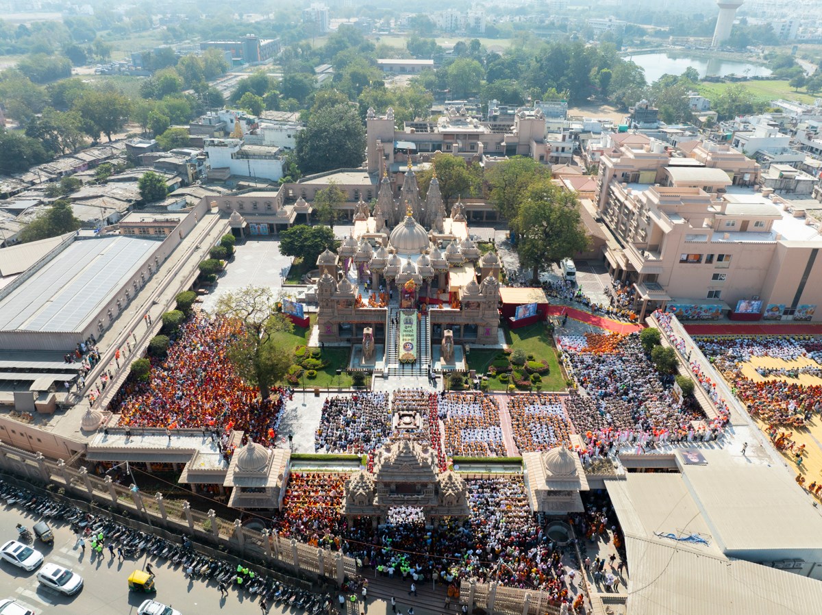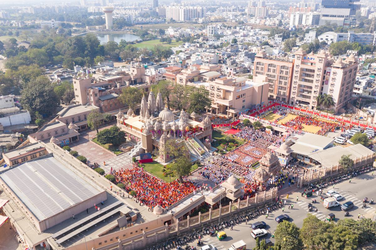 Aerial view of the BAPS Shri Swaminarayan Mandir, Atladara (Vadodara)