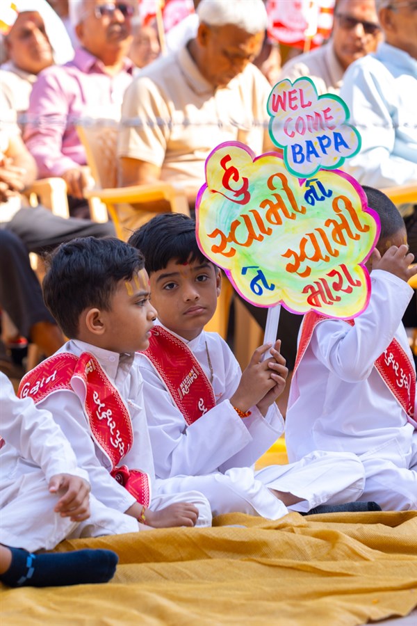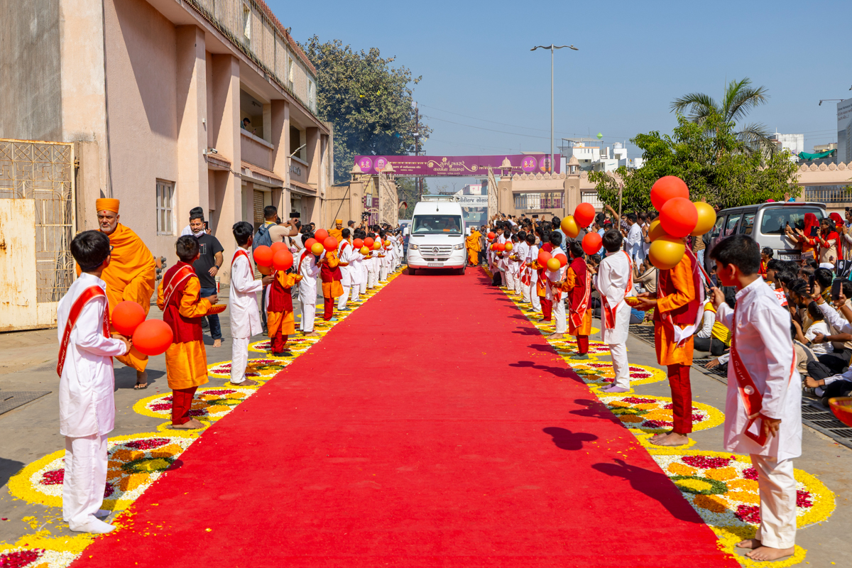 Balaks welcome Swamishri with balloons