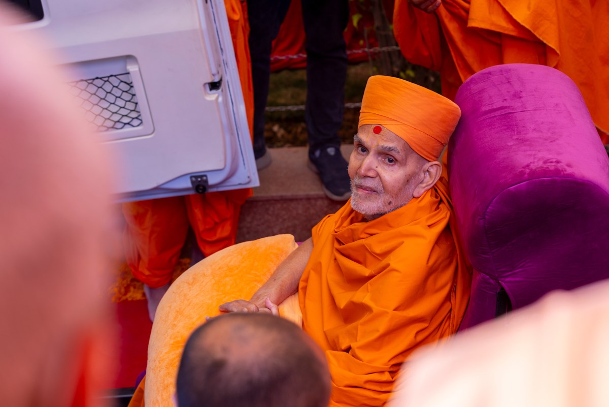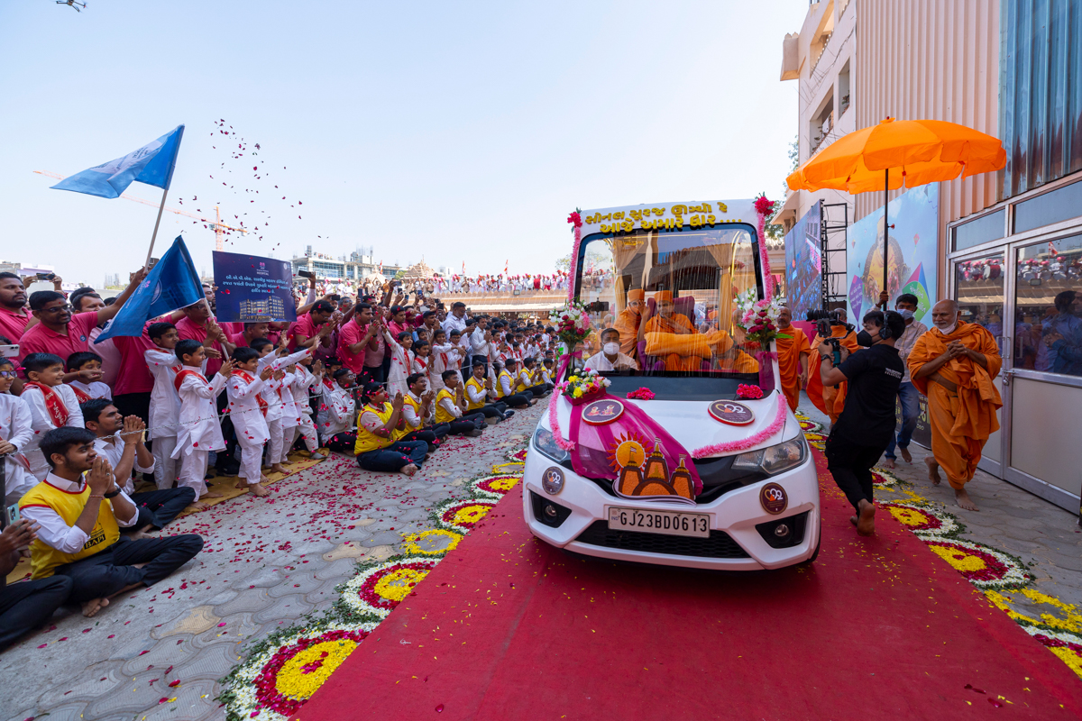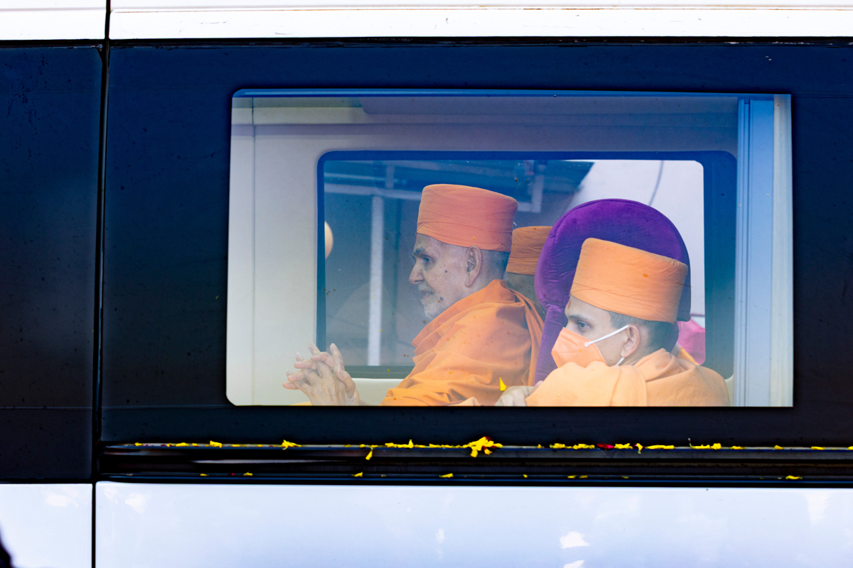 Swamishri arrives at BAPS Shri Swaminarayan Mandir, Atladara (Vadodara)