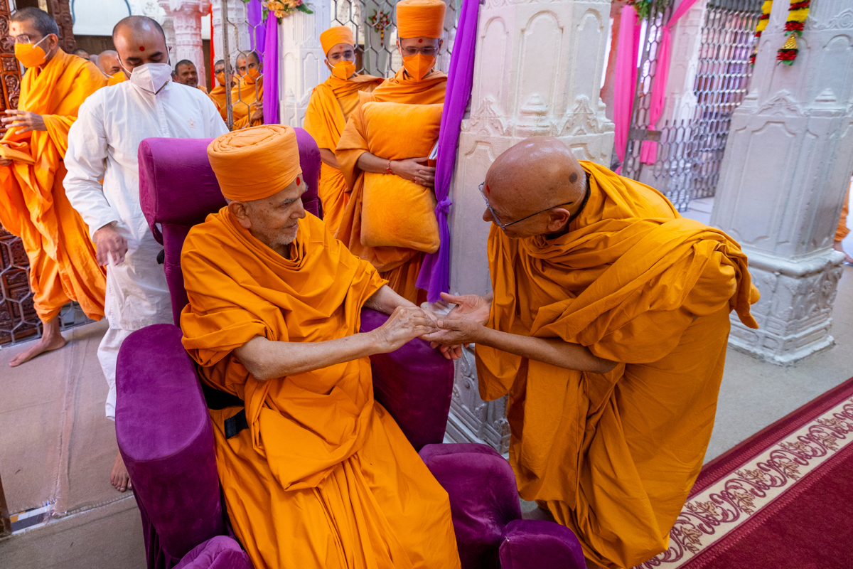 Pujya Tyagvallabh Swami greets Swamishri